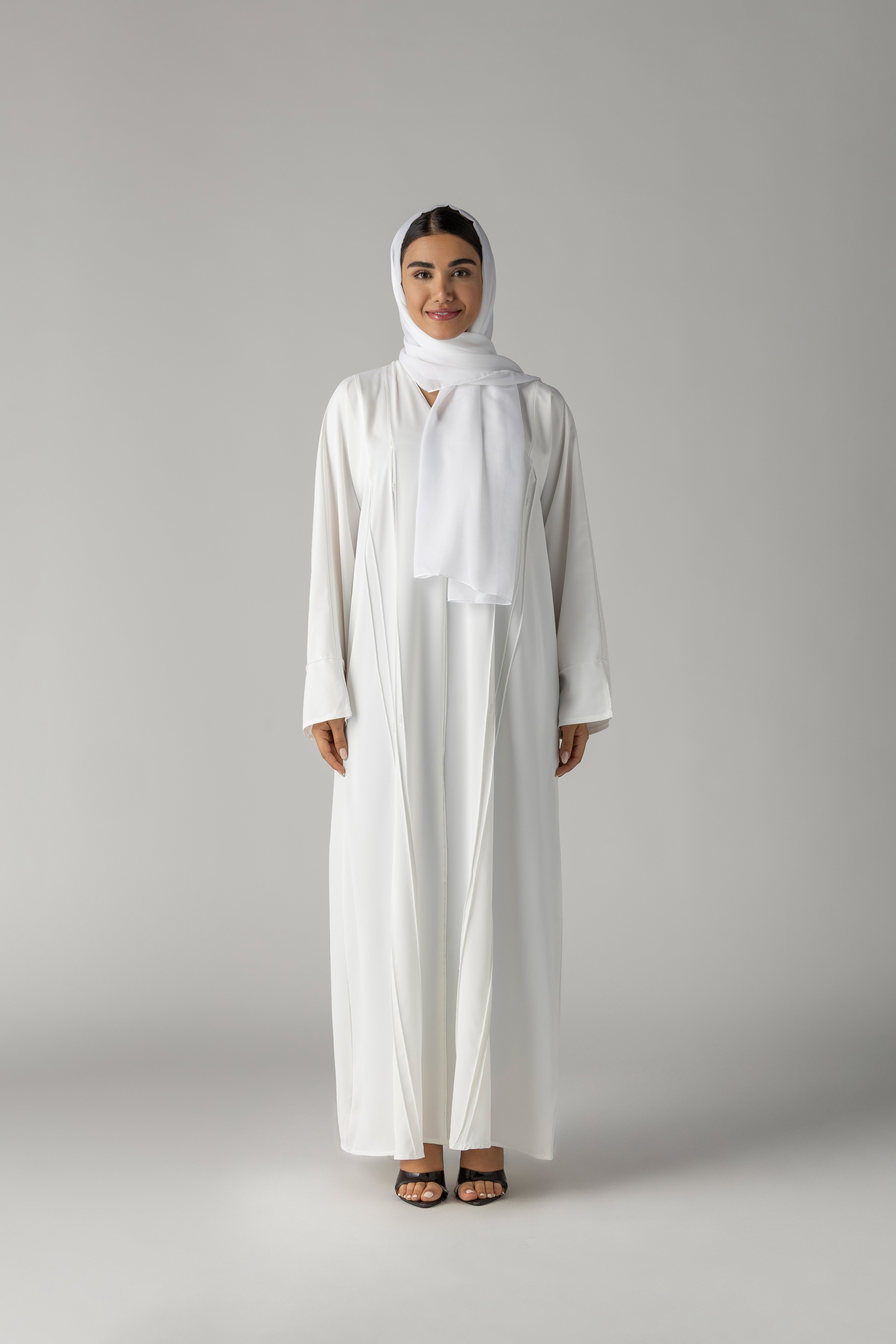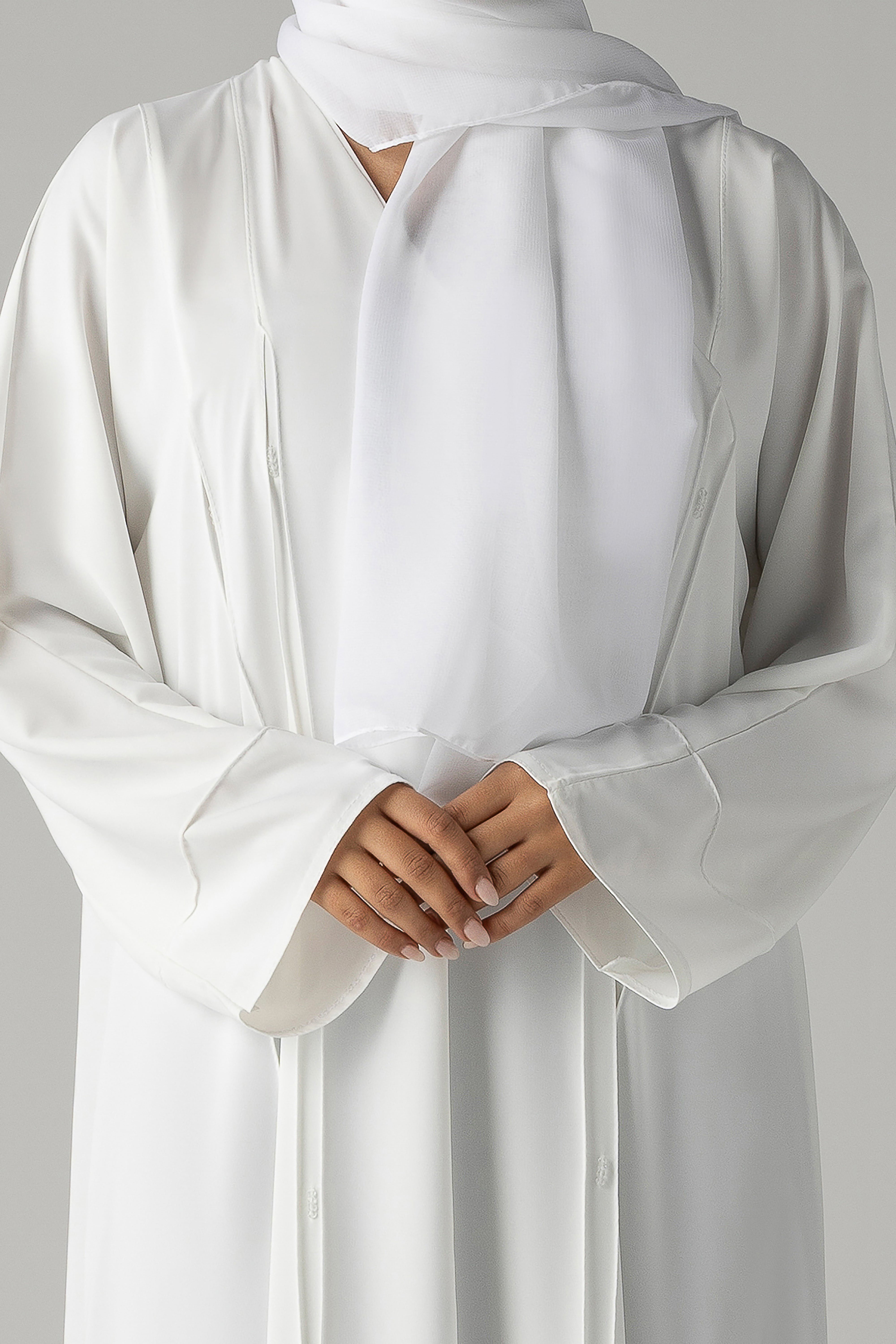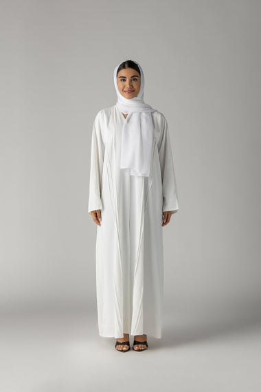Pure, refined, and effortlessly elegant, the Noor Essence Abaya is the definition of timeless sophistication. Designed in a soft white tone, this piece embraces minimalism with graceful structure and fluid movement.