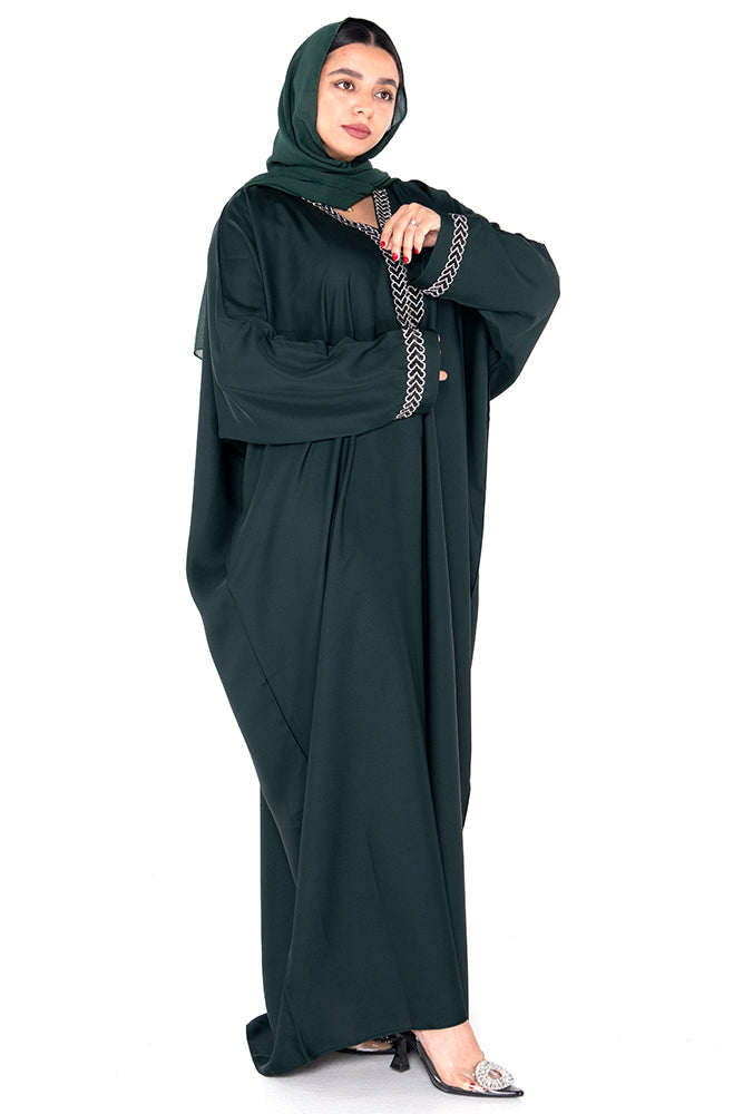 Refined elegance takes center stage with the Emerald Weave Nida Abaya. Made from luxurious premium Nida fabric, this abaya combines effortless comfort with sophisticated charm. The rich emerald green hue brings a refreshing yet regal twist to your wardrobe, beautifully accented with intricately woven embroidery along the neckline and cuffs.