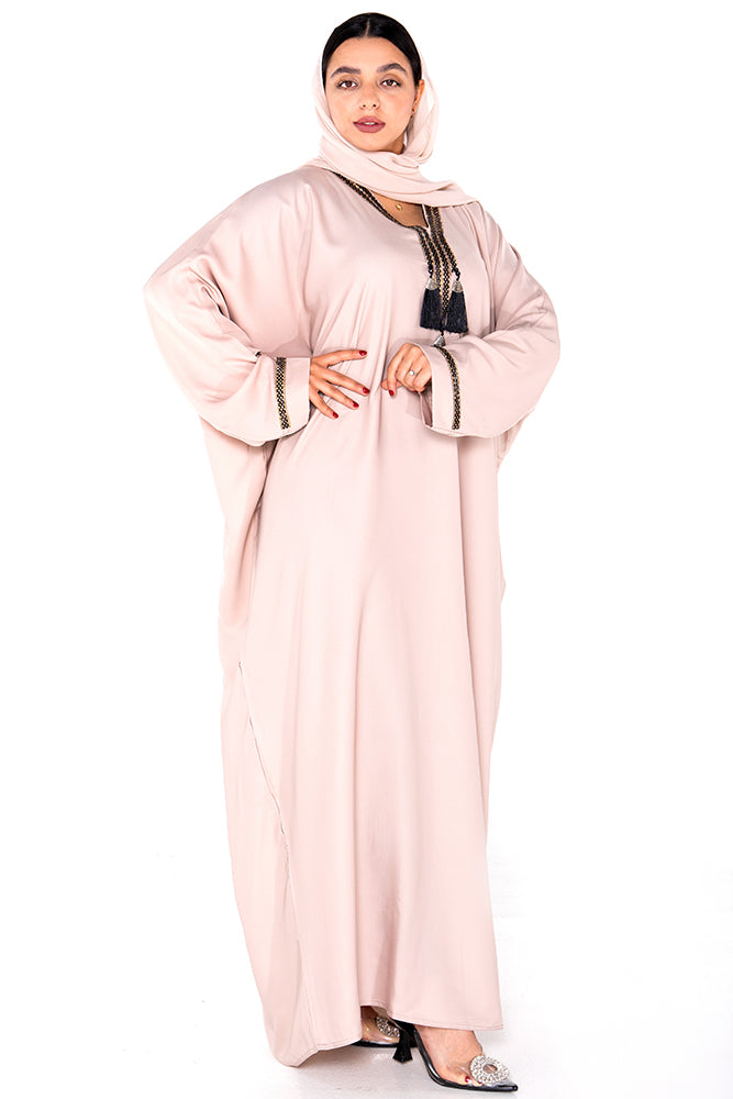 Graceful and elegant, the Blush Dusk Tassel Abaya is designed to make a subtle yet striking impression. Crafted from soft, flowing fabric in a delicate blush tone, this abaya features intricate embroidery around the neckline and sleeves, paired with statement black tassels for a luxurious finish.