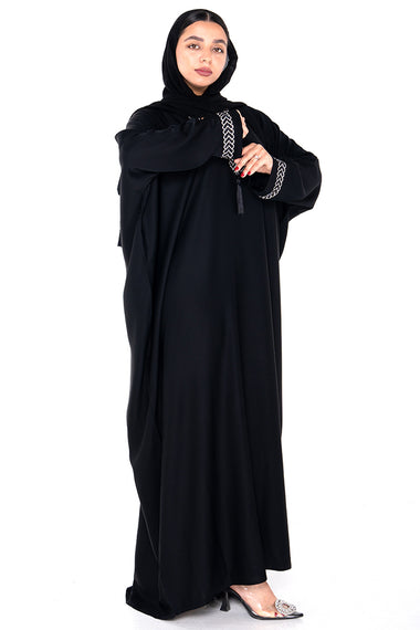 Sophistication meets simplicity in our Midnight Weave Nida Abaya. Crafted from premium Nida fabric, this piece offers a graceful flow and luxurious feel, perfect for both everyday wear and special occasions. The standout feature is its beautifully woven embroidery detailing along the neckline and cuffs—adding a modern twist to a timeless silhouette.