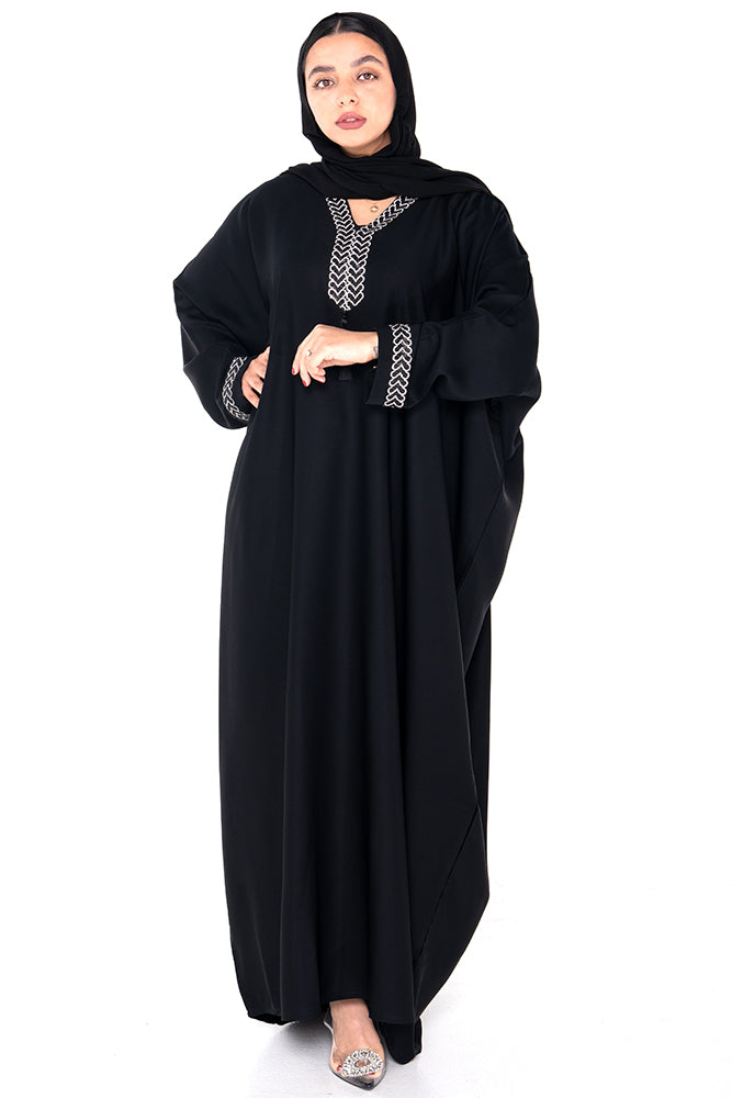Pair with a black or contrast embroidered hijab for a coordinated look. Dress it up with statement heels or opt for flats for everyday comfort. Ideal for styling with minimal jewellery to let the embroidery shine.