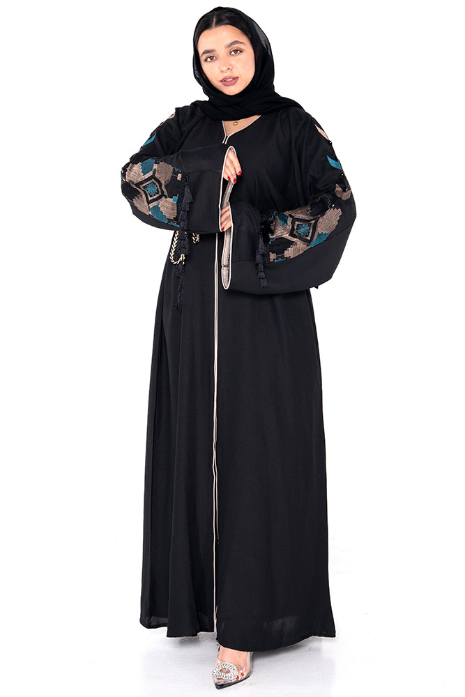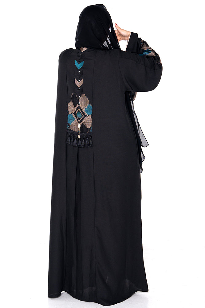 A statement of cultural elegance, the Al Firdaus Abaya celebrates heritage craftsmanship and modern design. Featuring a flowing silhouette in deep black, this piece is elevated by intricate hand-sewn embroidery in a refreshing palette of teal, beige, and charcoal — forming a bold, geometric tapestry across the back and arms.