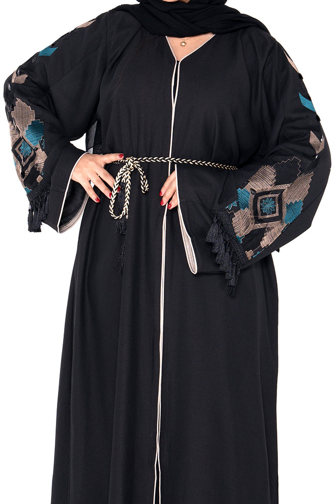 The embroidery's layout draws inspiration from traditional motifs, lending the abaya an artisanal depth that feels both rooted and contemporary. A coordinating rope belt and tassel details add the perfect touch of flair, offering structure and movement in equal measure.