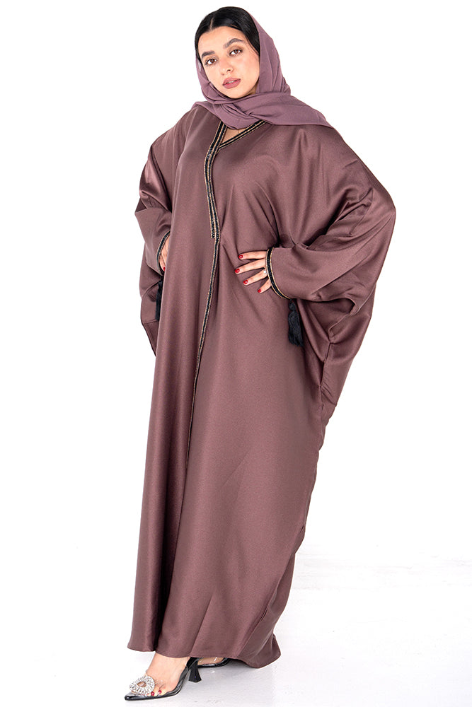 The Al Mahra Cocoa Tassel Abaya is a statement of refined elegance and effortless modesty. Crafted from premium Nida fabric, this abaya showcases a deep cocoa brown tone enriched by a contrasting black and gold trim running delicately along the front. The loose, flowing silhouette is perfect for all body shapes and ensures both comfort and grace in every movement.