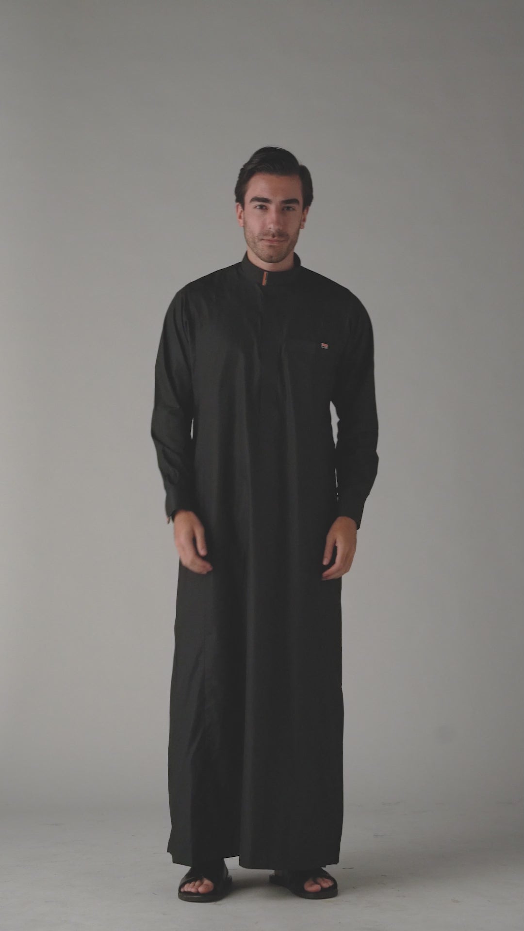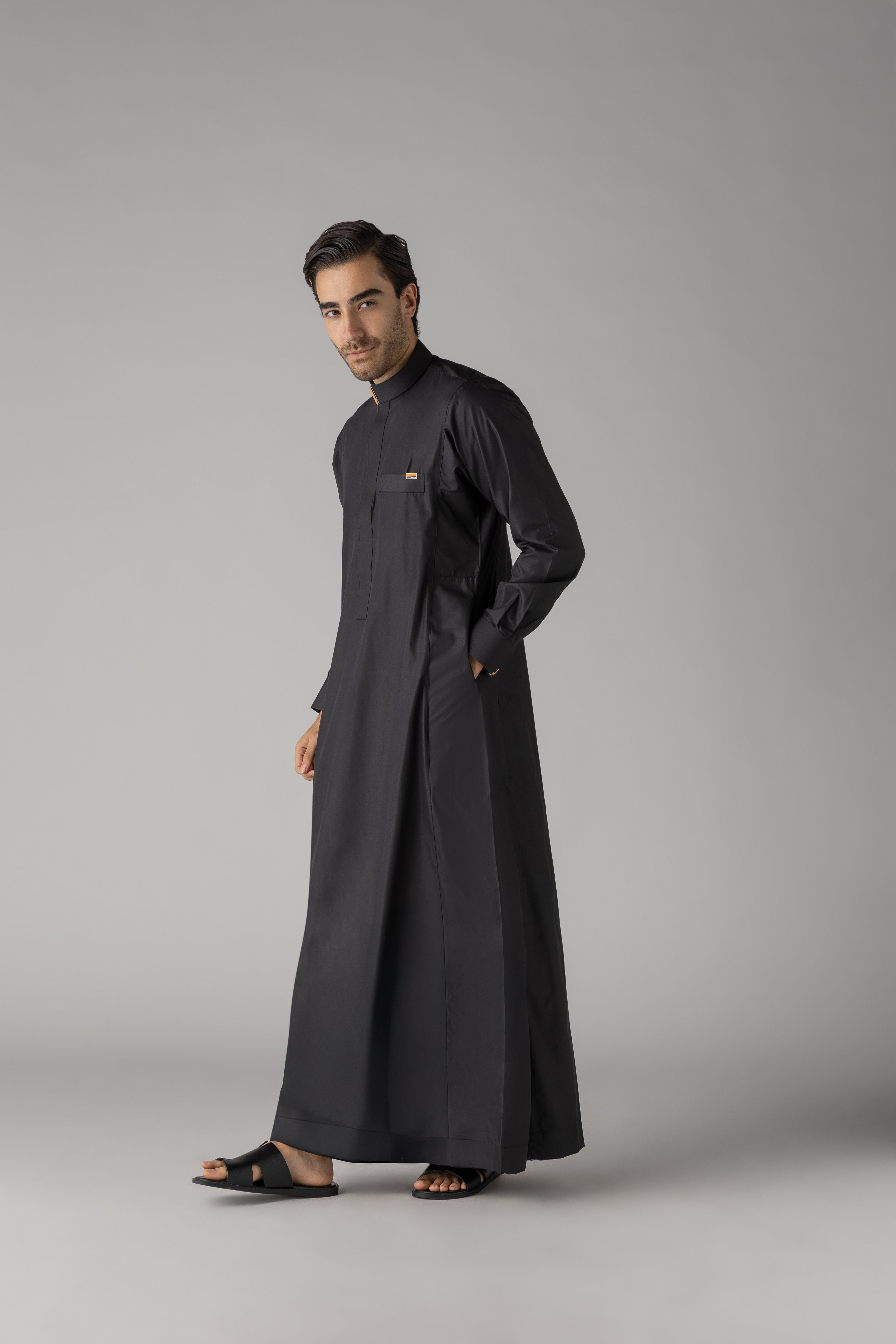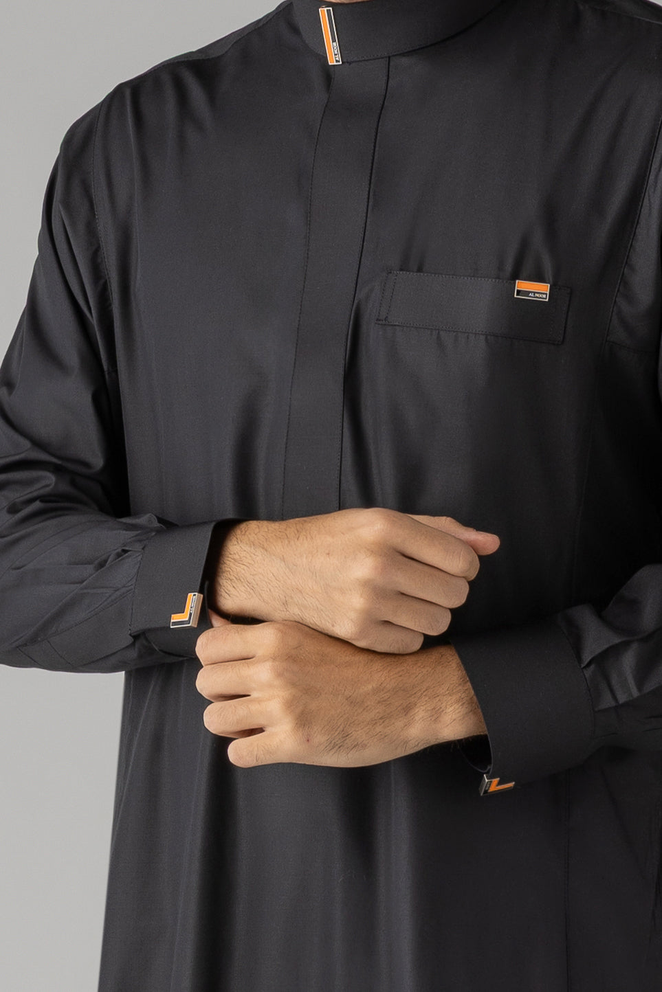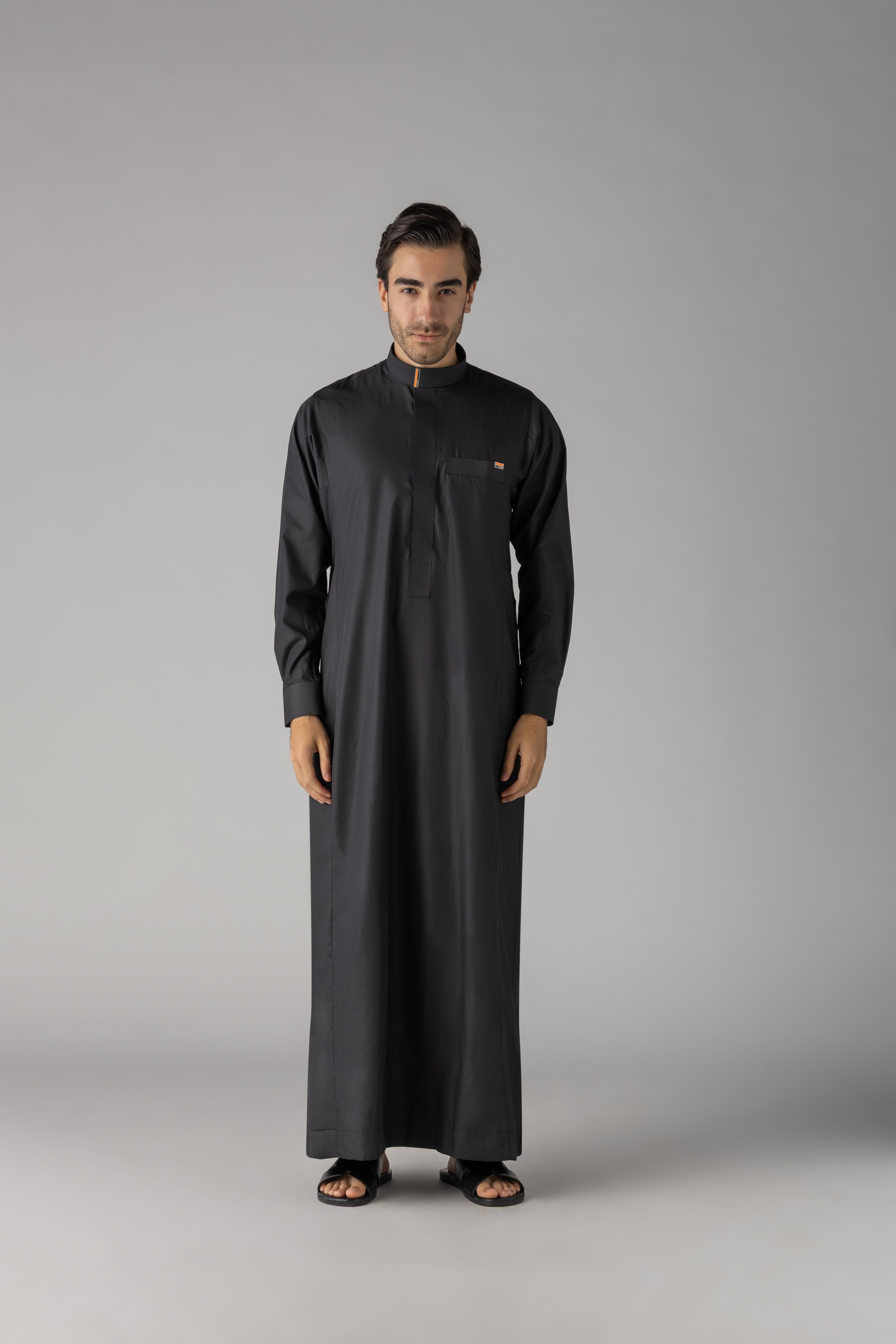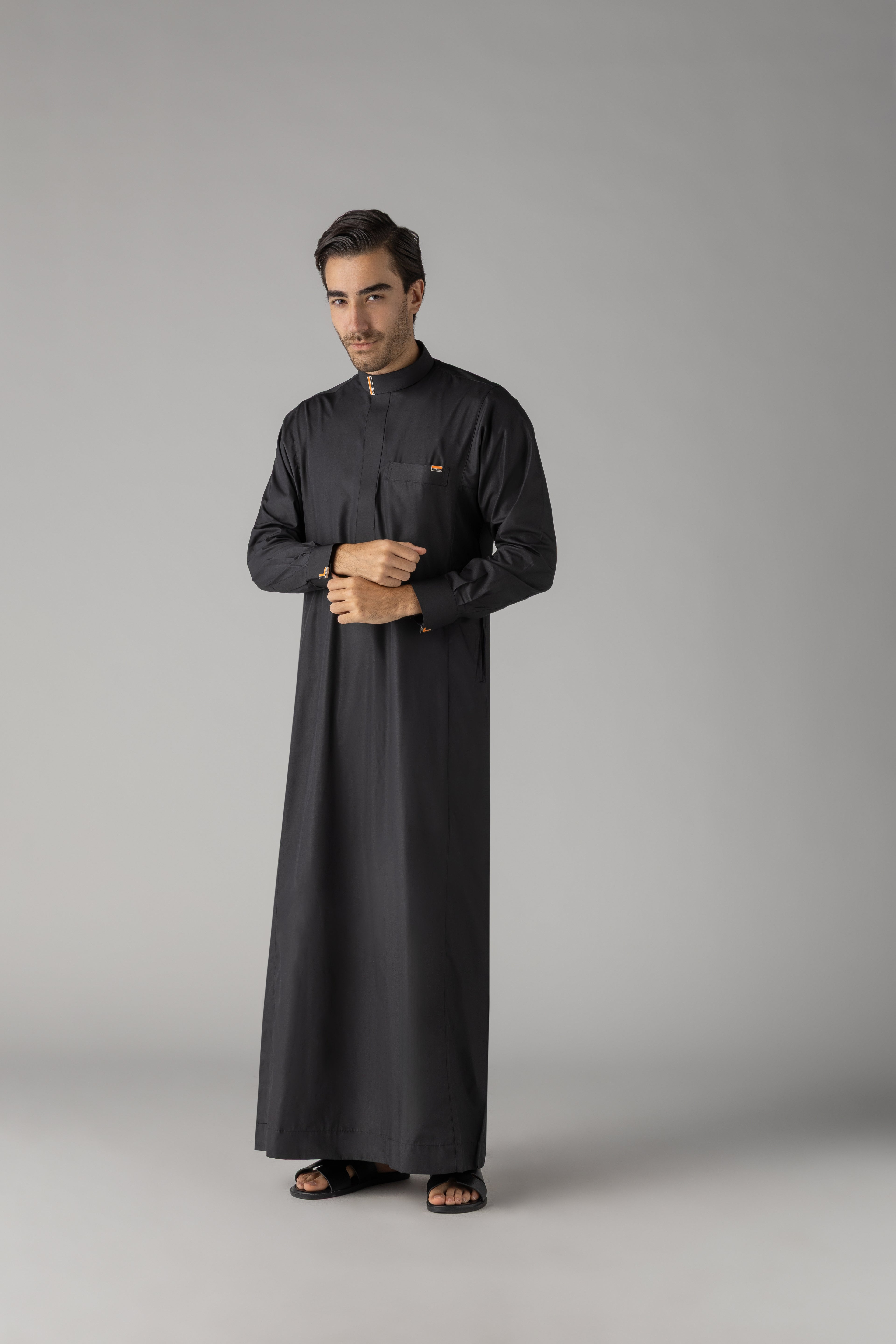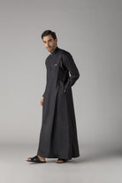 The Buckle Black represents contemporary refinement with distinctive detailing. This premium thobe features a commanding black silhouette elevated by elegant buckle embellishments adorning both the sleeves and collar, adding a modern edge to traditional design. The carefully positioned hardware creates visual interest whilst maintaining the garment's dignified aesthetic. Crafted for those who appreciate innovative styling without compromising authenticity, this thobe seamlessly blends classic heritage with contemporary sophistication. Ideal for formal occasions or everyday wear that demands distinction, it offers a refined alternative for the discerning individual seeking something truly exceptional.