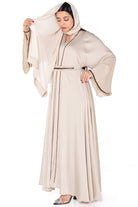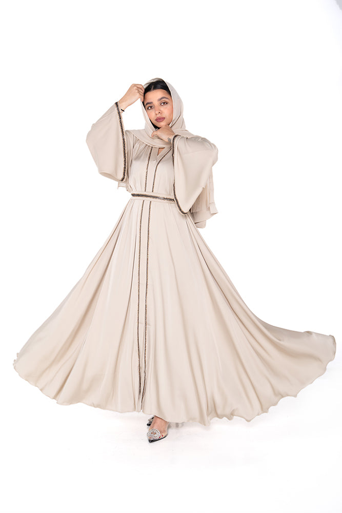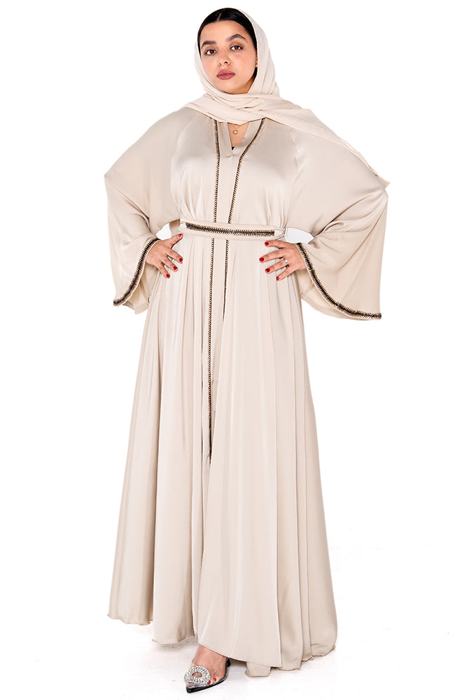 Radiate timeless elegance in the Noor Luxe Abaya, crafted from premium soft Nida fabric in a graceful cream shade. This flowing abaya features structured pleats, wide bell sleeves, and a braided trim along the front and cuffs for a sophisticated finish. The included braided belt offers versatile styling—wear it open for a relaxed silhouette or cinched for a defined waist.