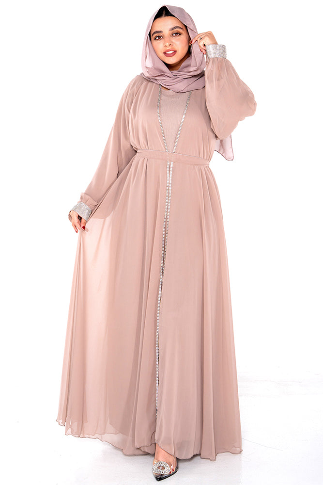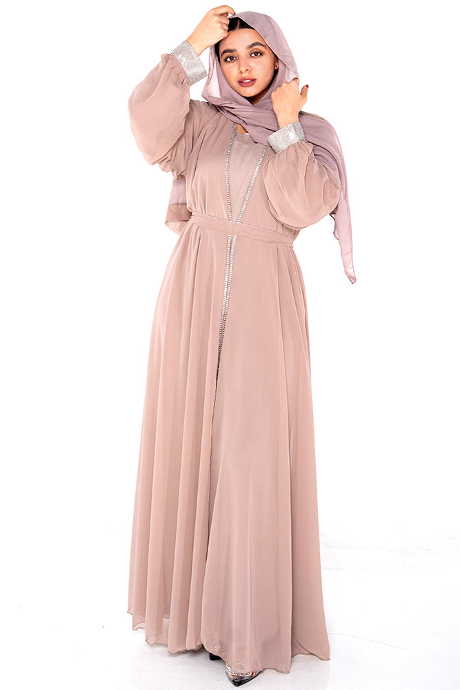 Make a statement with this elegant Nude chiffon abaya, designed with a flowy silhouette and refined sparkle. The standout feature—diamond-embellished cuffs—adds a touch of luxury and sophistication, perfect for evening wear or special occasions.