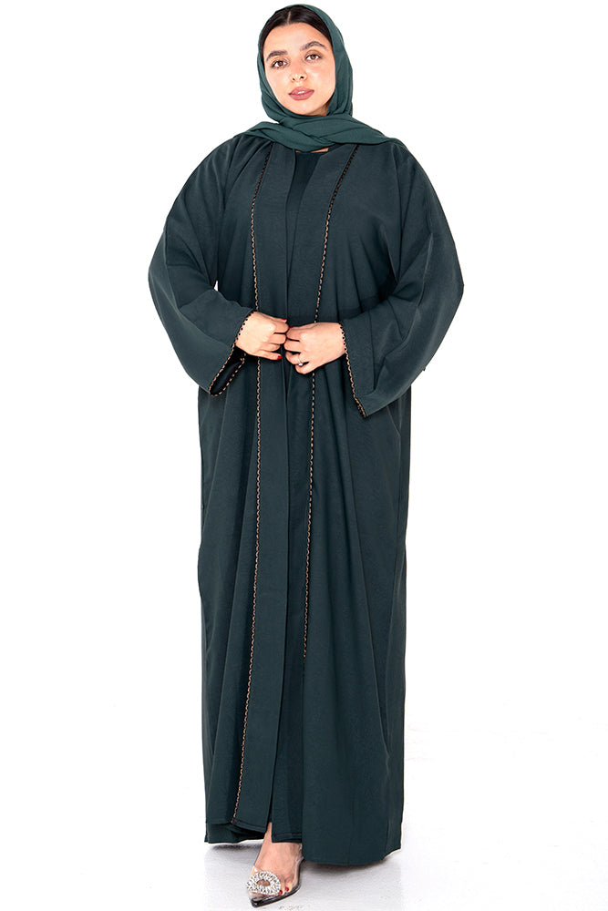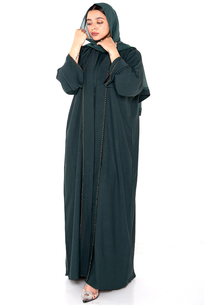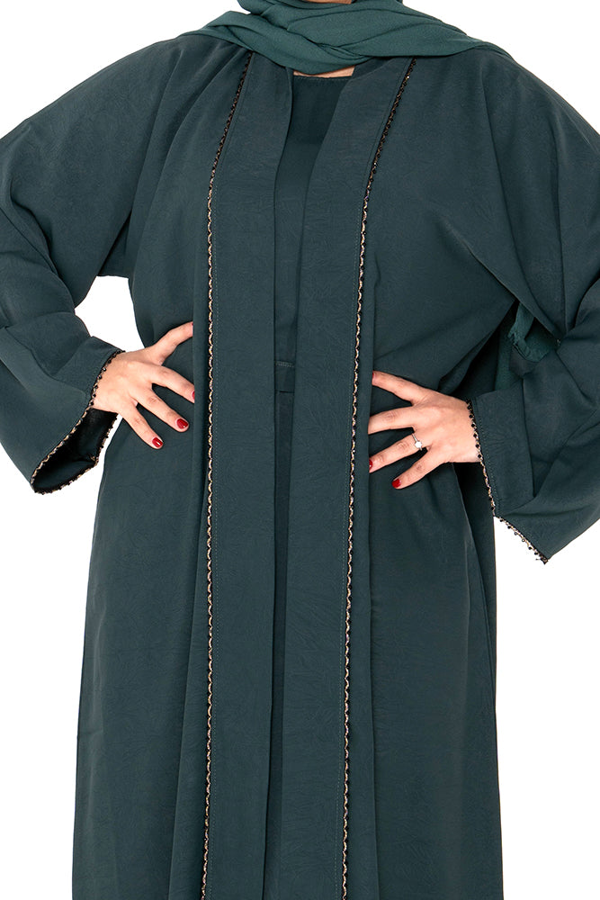 The standout detail is the fine embellished trim that borders the front opening and sleeves, adding a subtle hint of sparkle and refinement. Designed for the modern modest wardrobe, this abaya offers both structure and fluidity, making it ideal for layering over simple dresses or co-ords.