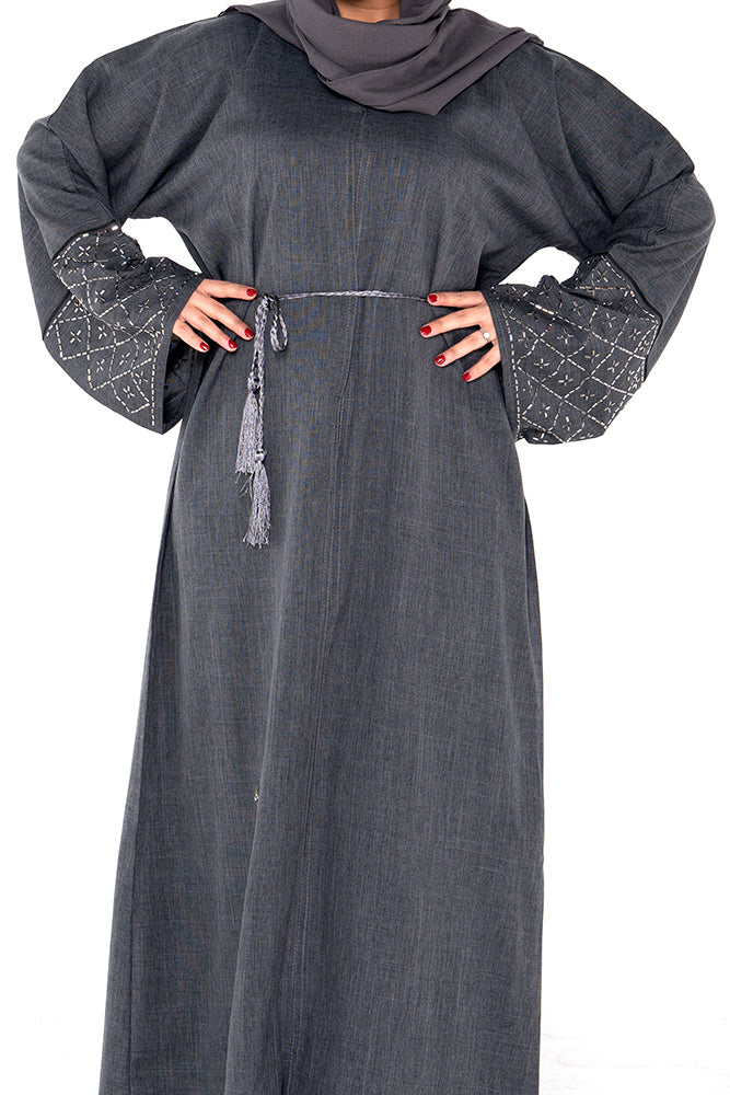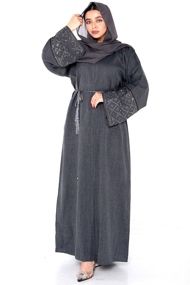 Chic and contemporary, this denim grey linen abaya combines effortless style with subtle sparkle. Made from breathable, high-quality linen fabric, it features sequin-embellished sleeves that add a touch of glamour without compromising on modesty.