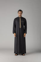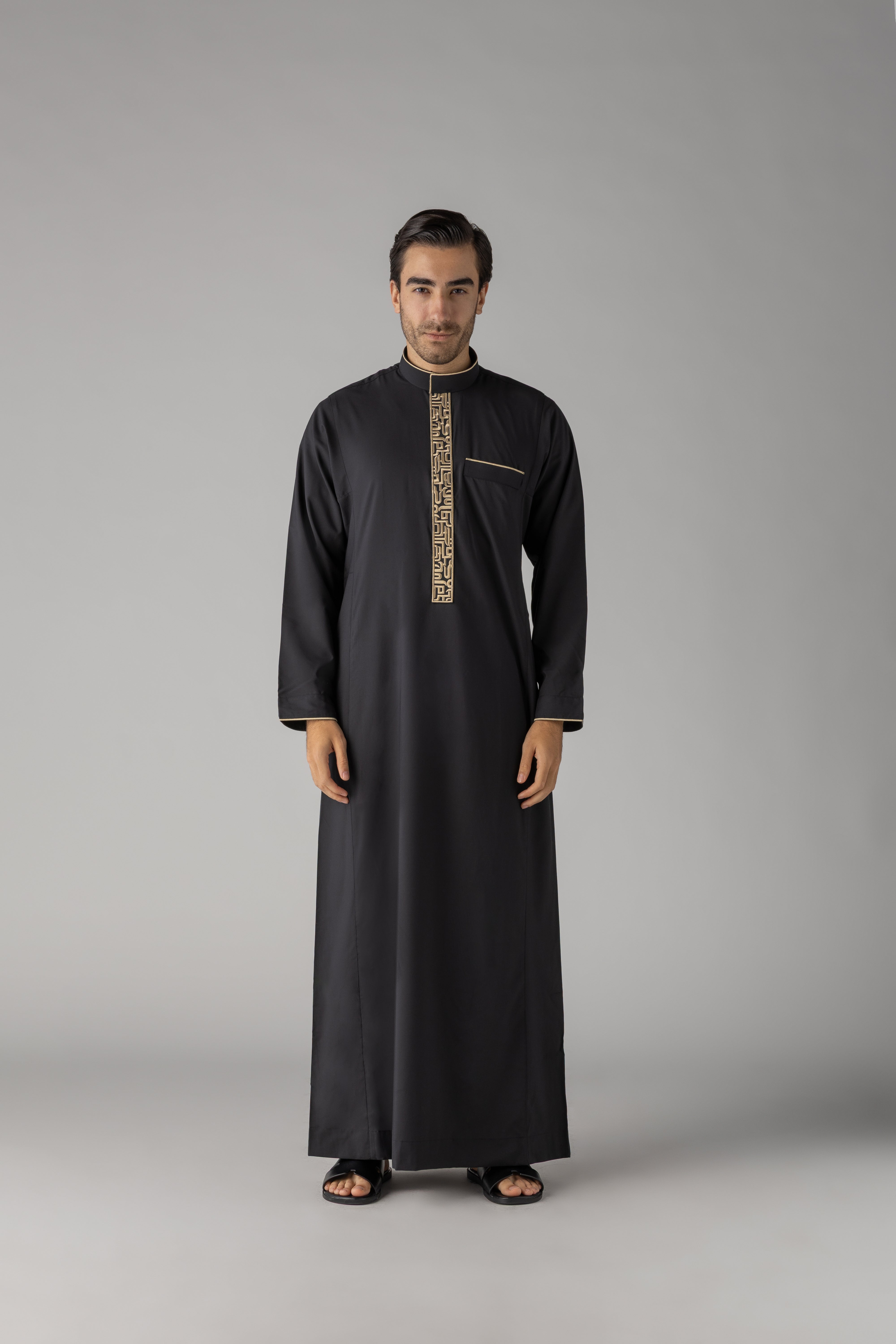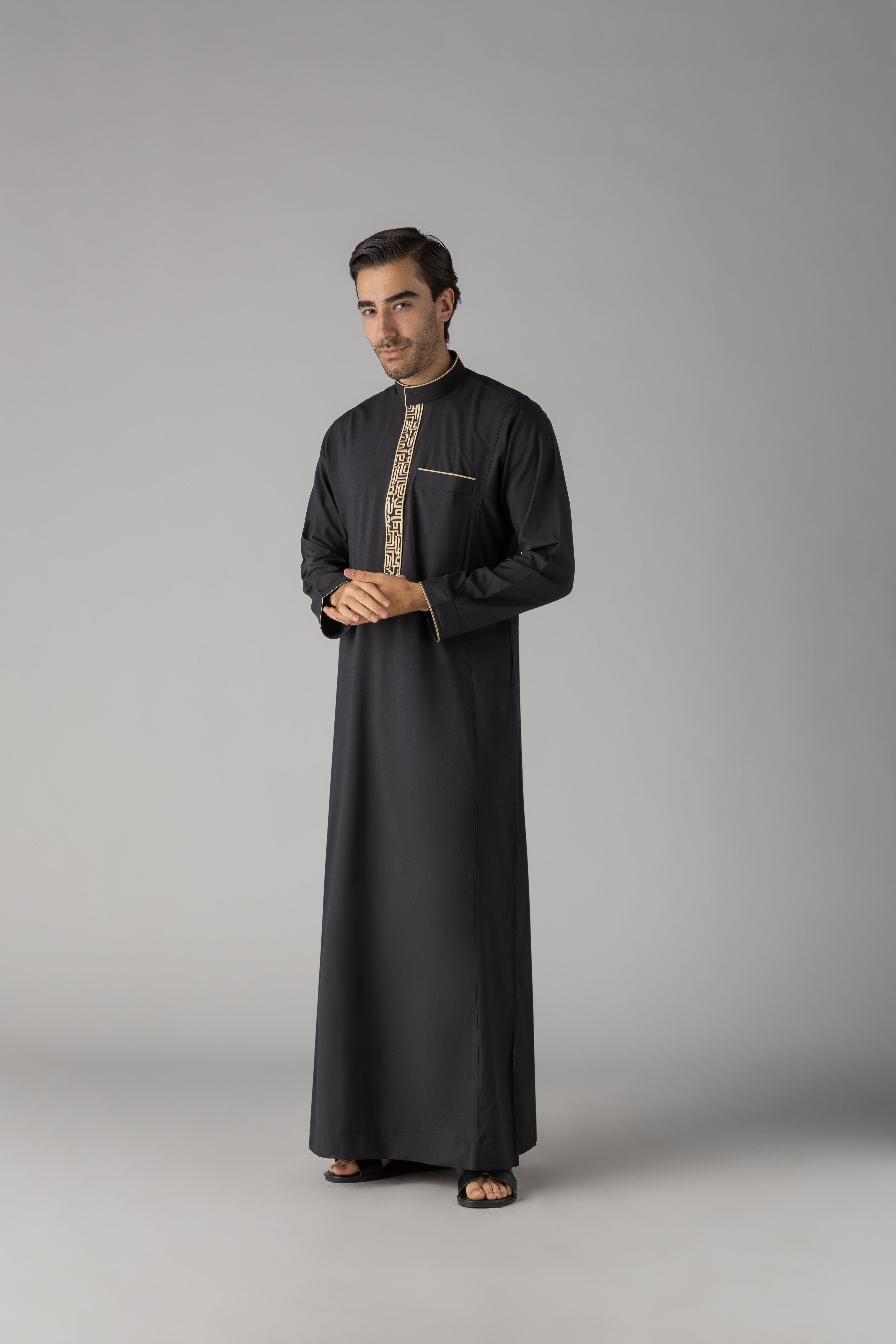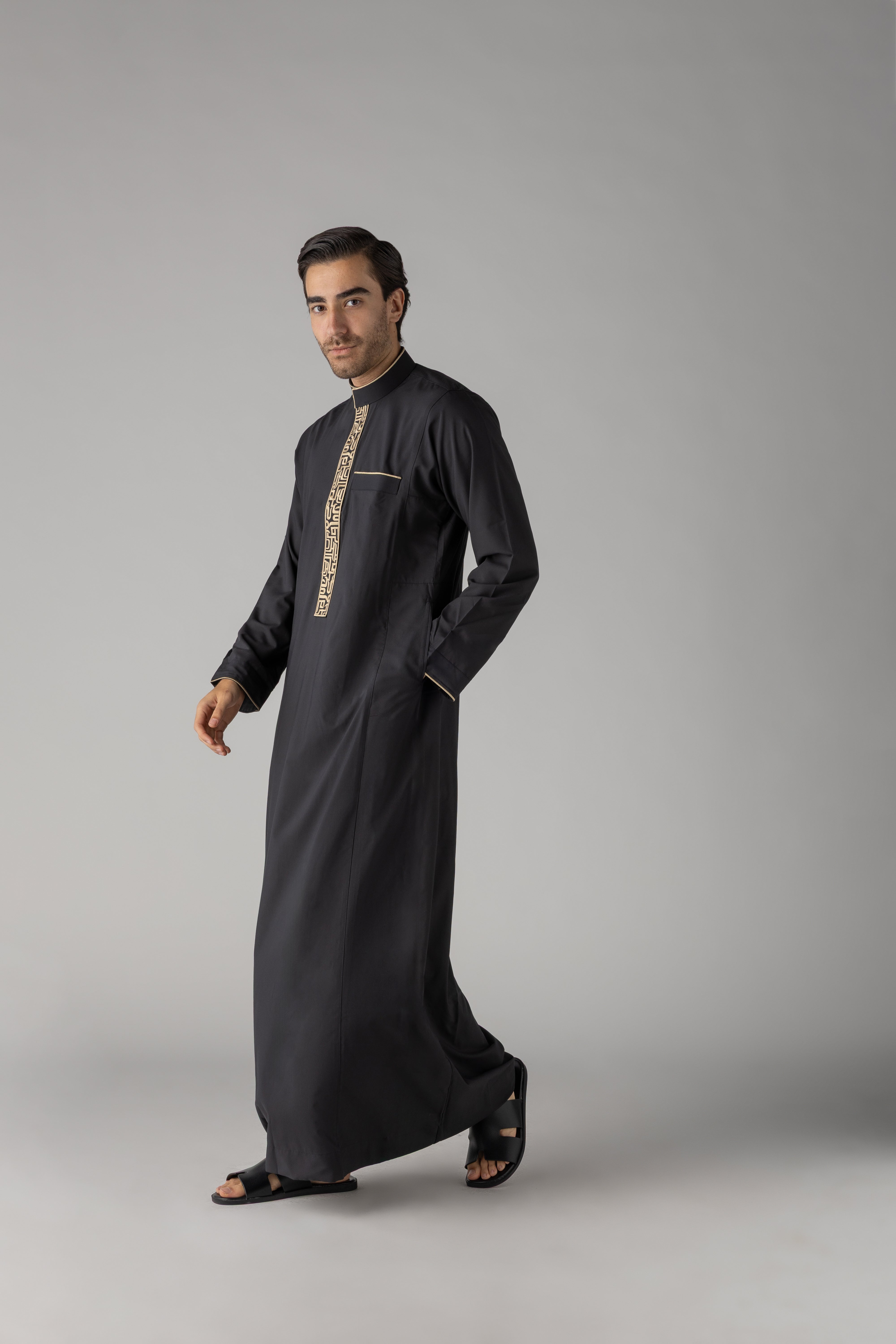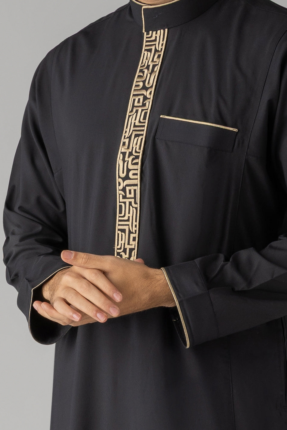 The Huruf Black showcases timeless elegance through bold contrast and refined artistry. This striking thobe pairs a deep black foundation with resplendent gold calligraphy, creating a dramatic yet dignified aesthetic. The intricately rendered script work celebrates Islamic heritage whilst commanding attention through its luminous detailing. Designed for the discerning wearer, this piece balances spiritual significance with contemporary sophistication. Perfect for formal occasions, evening gatherings, or those seeking a thobe that makes a powerful statement whilst honouring tradition. A garment that transcends seasons and trends, offering enduring style and cultural authenticity.