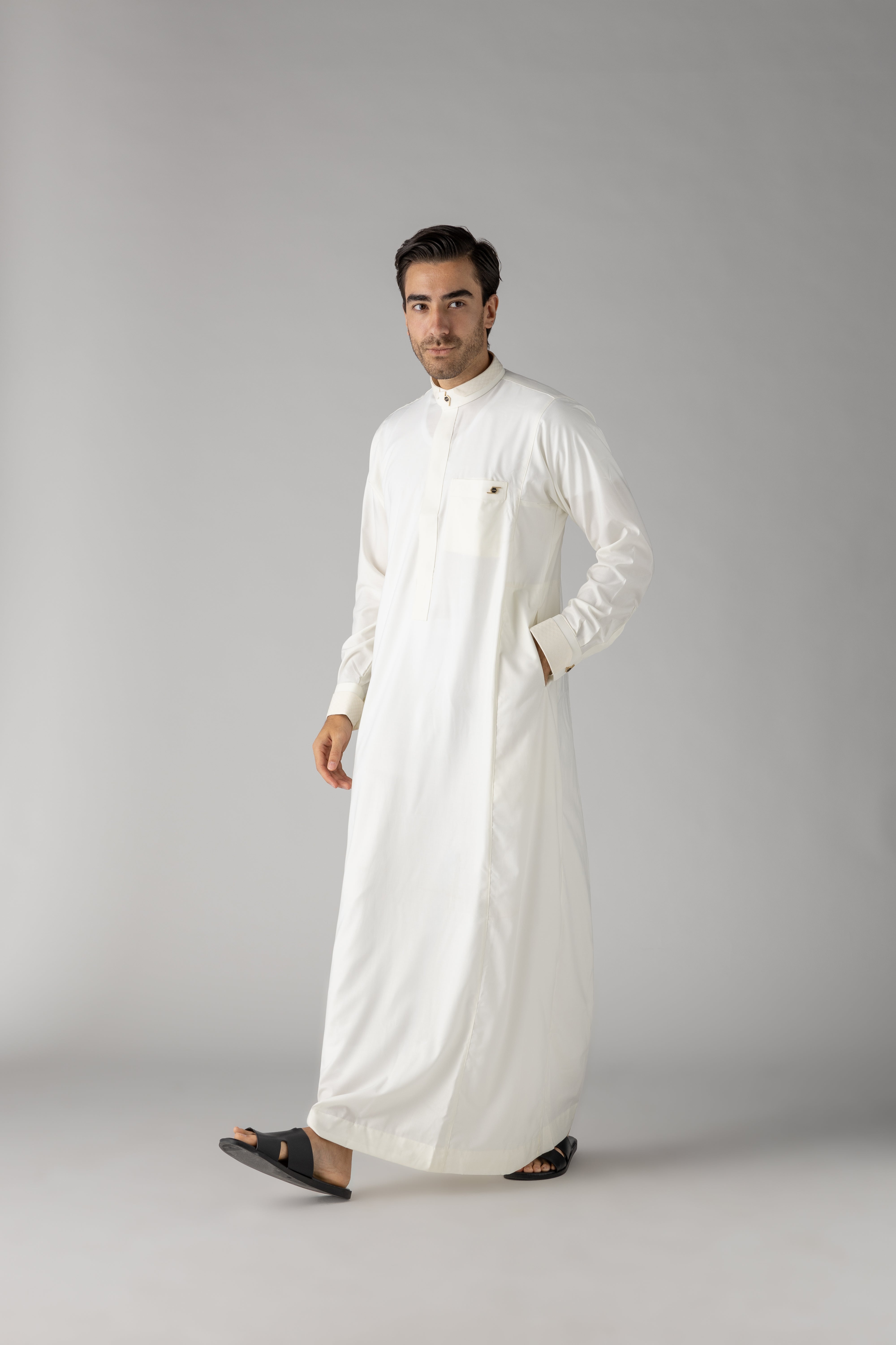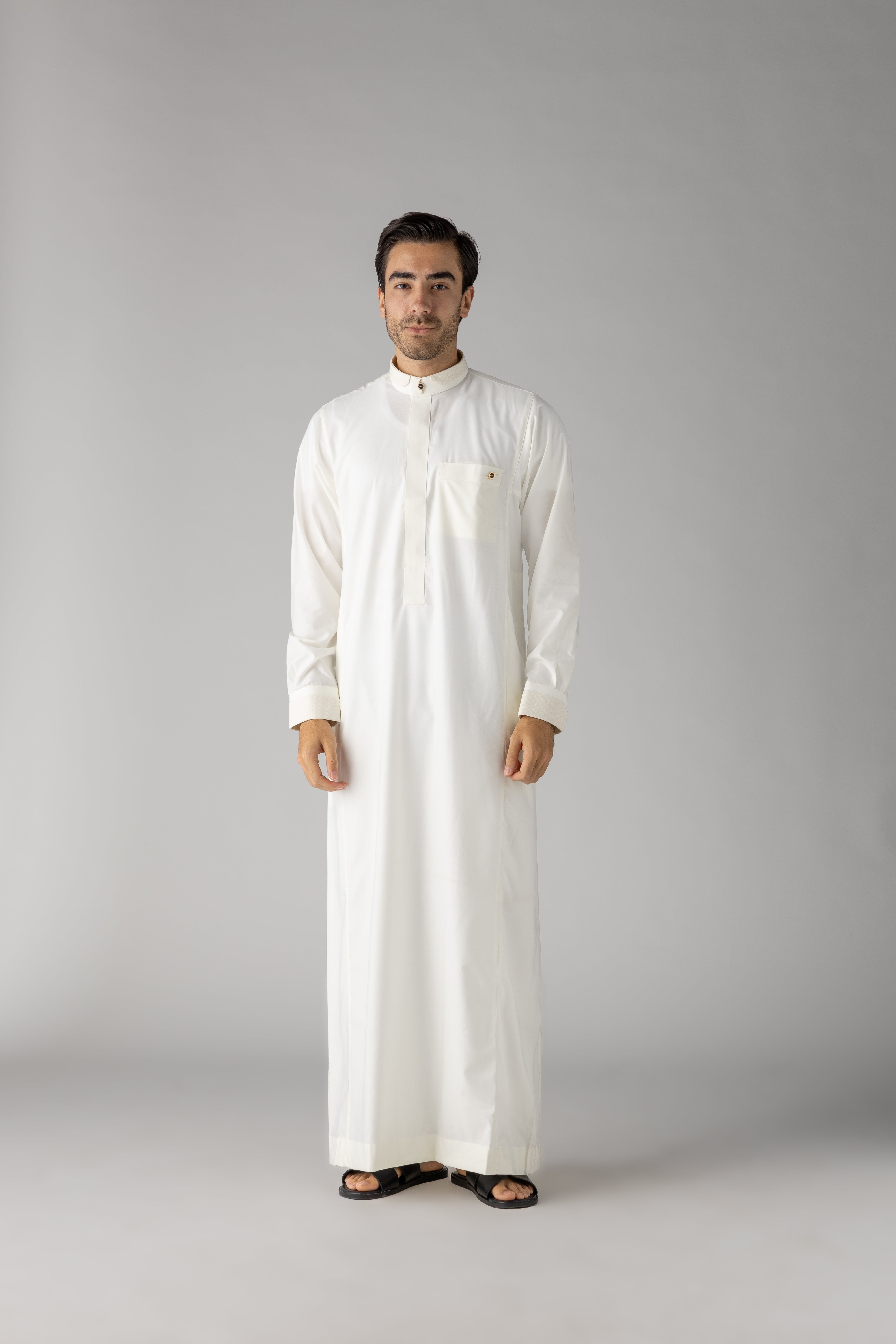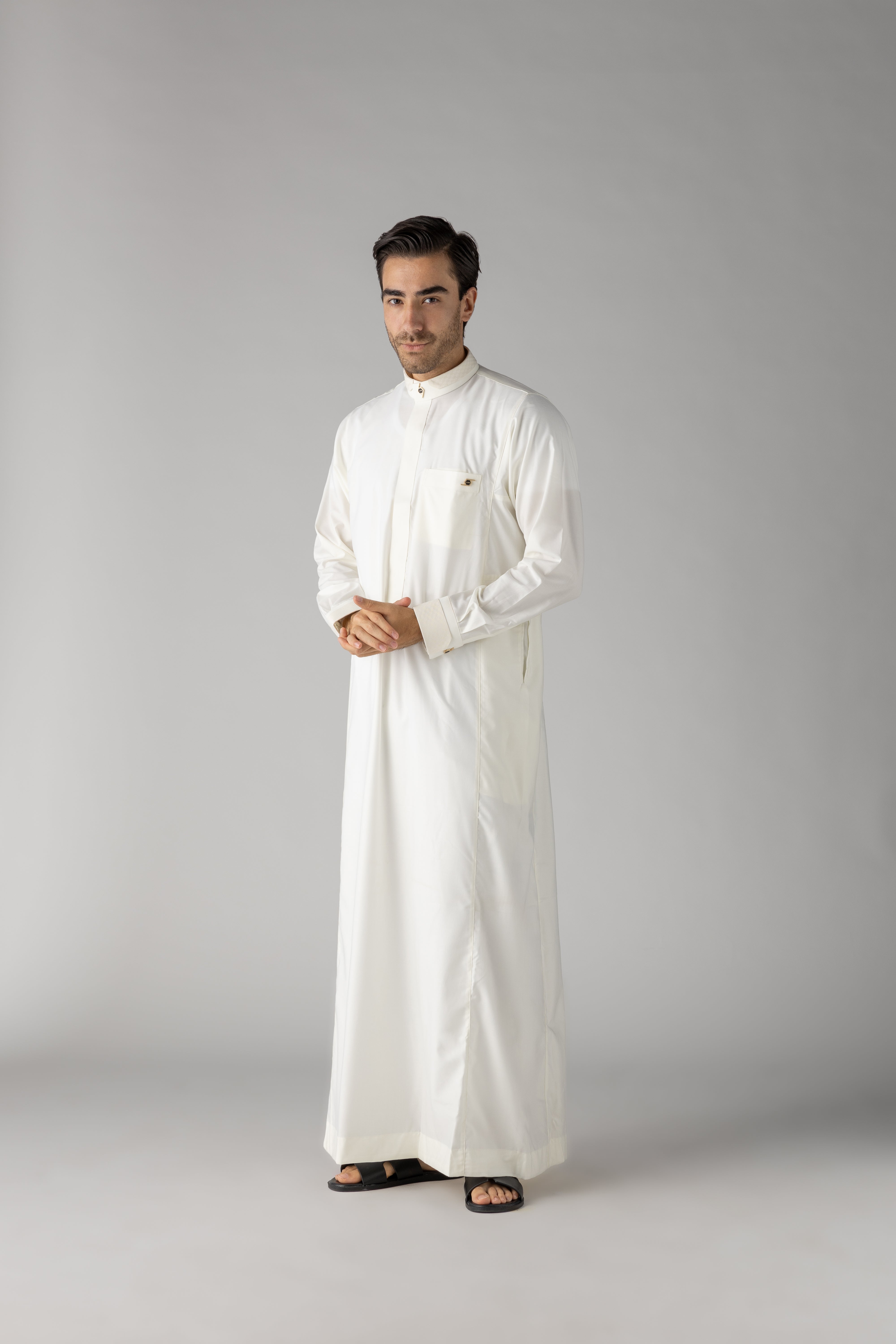 The Cream Collar Thobe with overlapping Jacquard fabric on the collar and cuffs is a sophisticated and stylish garment that combines tradition with modernity. Its elegant design, functional features, and unique details make it a perfect choice for those looking to elevate their wardrobe and make a lasting impression.