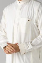 The Cream Collar Thobe with overlapping Jacquard fabric on the collar and cuffs is a refined and stylish garment that merges traditional elegance with modern sophistication. This thobe is designed to stand out with its unique features and meticulous craftsmanship, making it an excellent choice for those looking to make a statement.