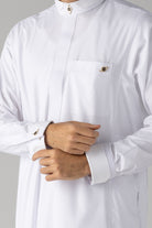 The White Collar Thobe with overlapping Jacquard fabric on the collar and cuffs is a refined and stylish garment that merges traditional elegance with modern sophistication. This thobe is designed to stand out with its unique features and meticulous craftsmanship, making it an excellent choice for those looking to make a statement.
