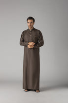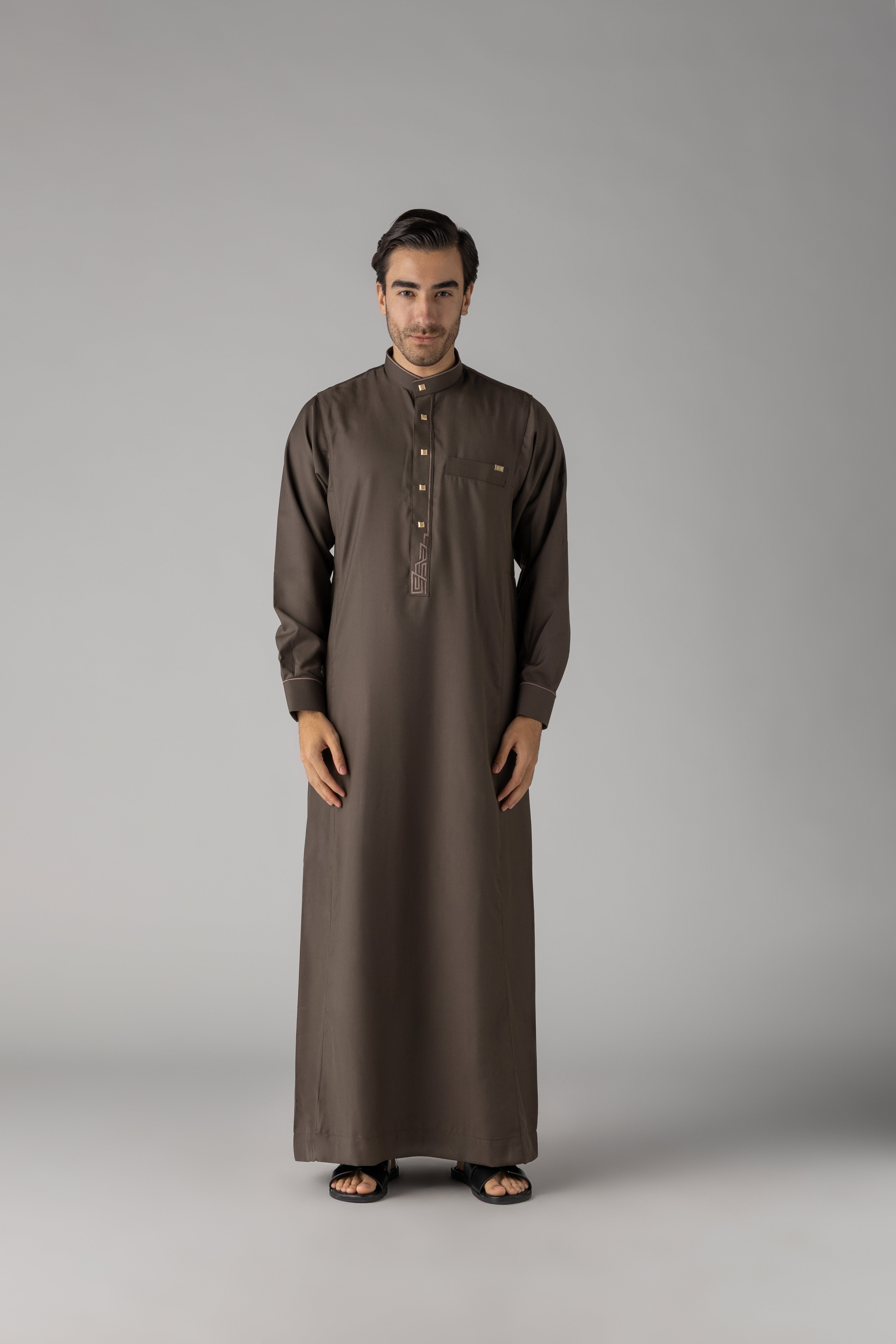Elevate your wardrobe with the Cream Collar Thobe from the Al Noor Collection, designed for sophistication and elegance. This thobe features:
