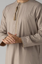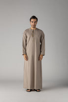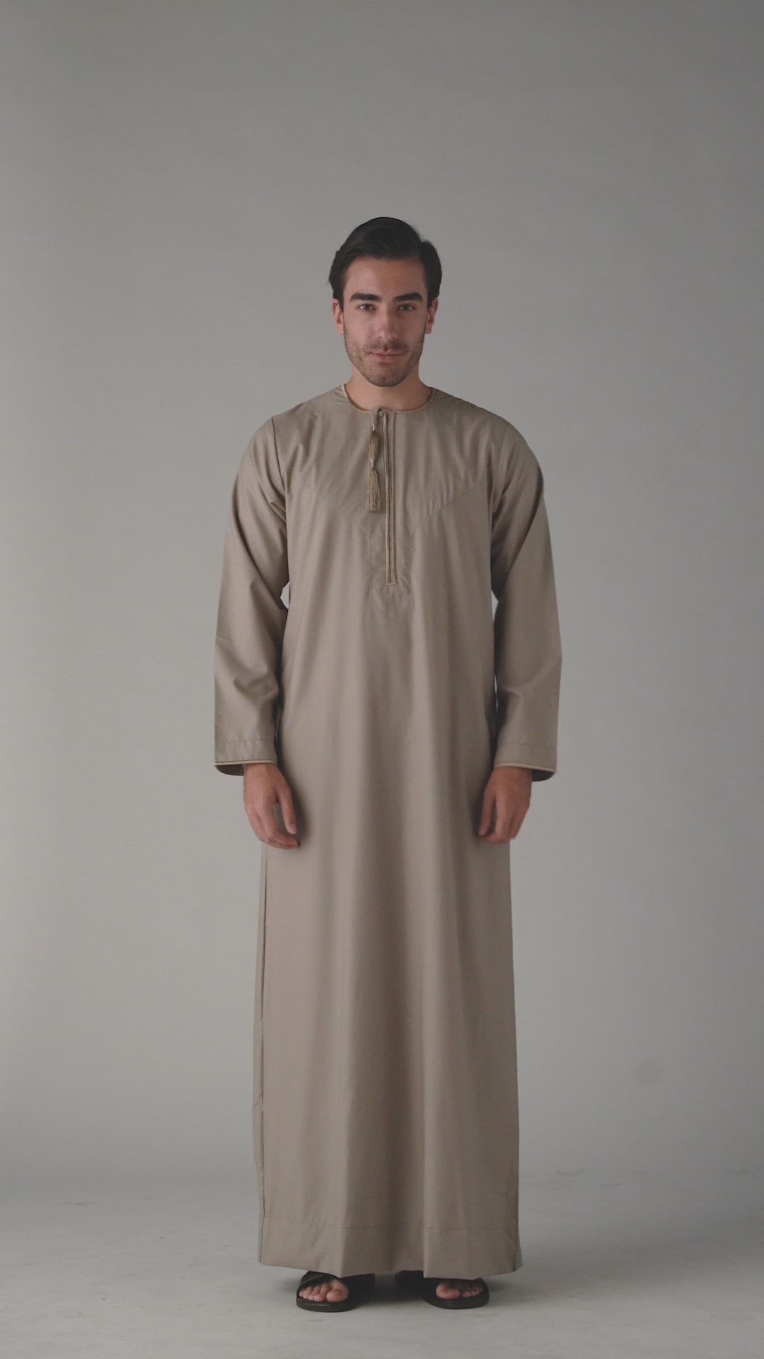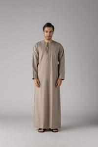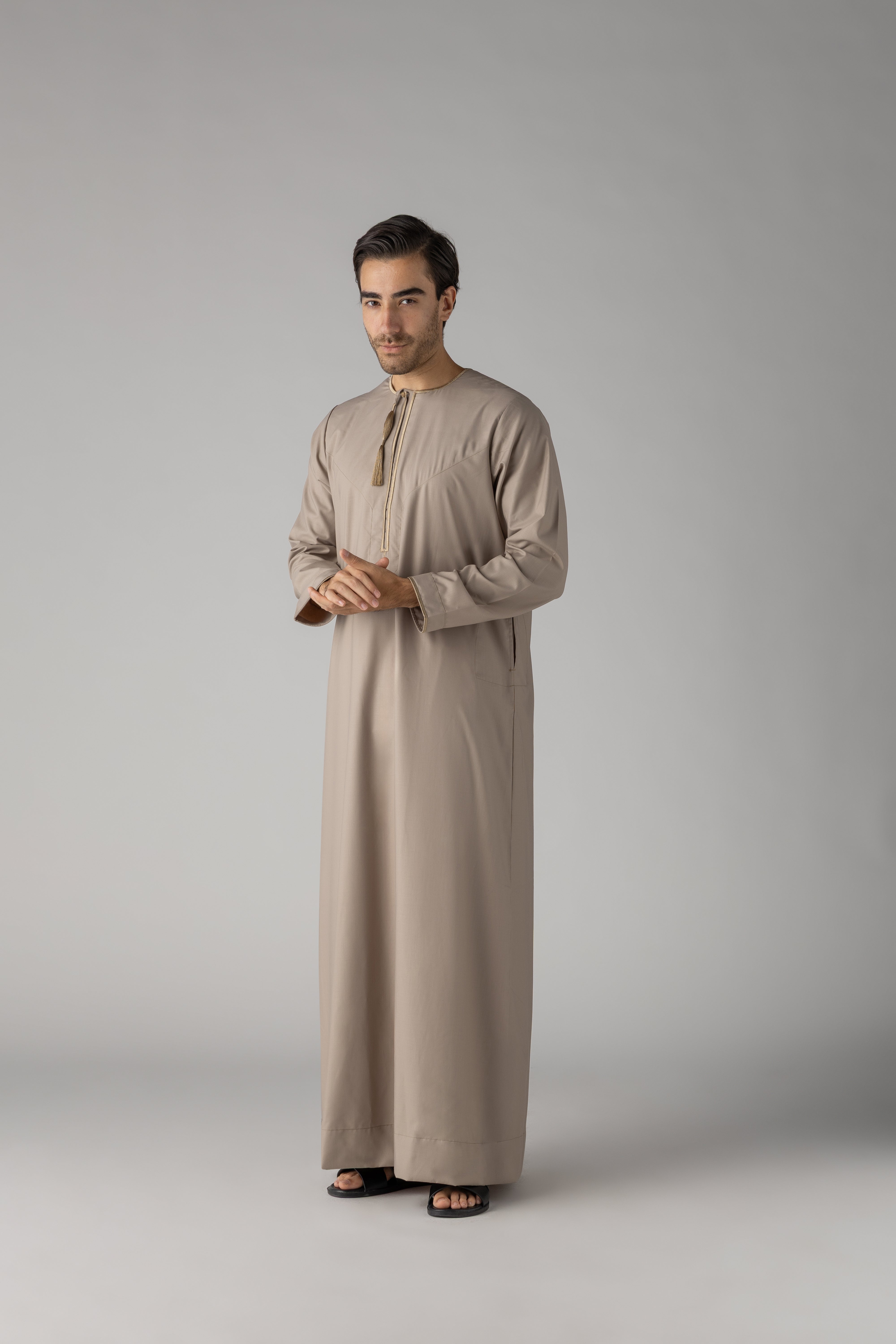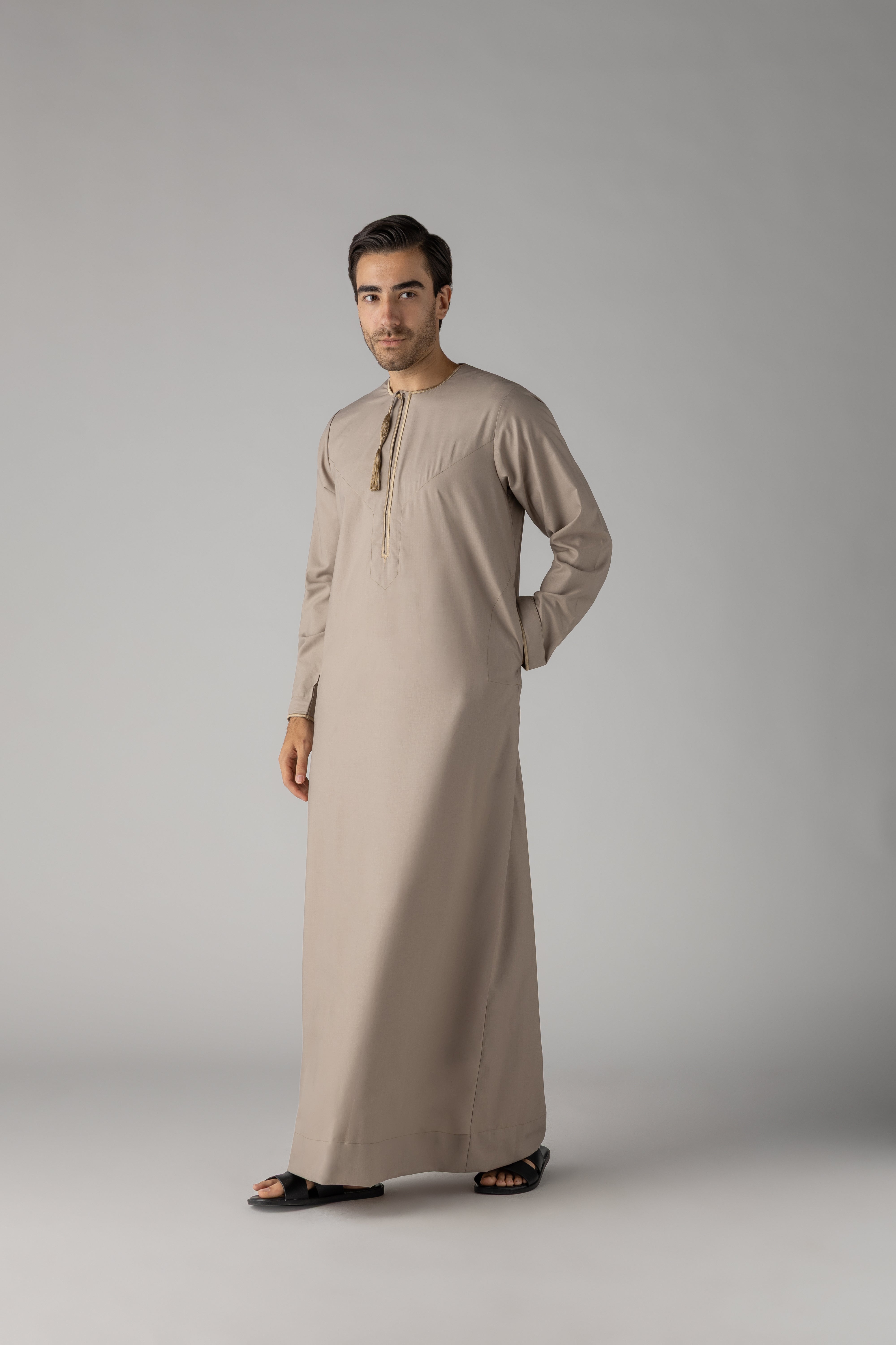 The J143 C2 Beige Habeel represents the pinnacle of Omani tailoring tradition. This classic beige thobe showcases the refined Habeel cut, celebrated for its elegant drape and impeccable construction. The warm, neutral tone exudes understated sophistication, making it an indispensable choice for those who appreciate authentic craftsmanship. Whether worn for special occasions or daily elegance, this thobe seamlessly transitions between settings. Its timeless appeal and superior quality ensure it remains a cherished staple in your collection for years to come.