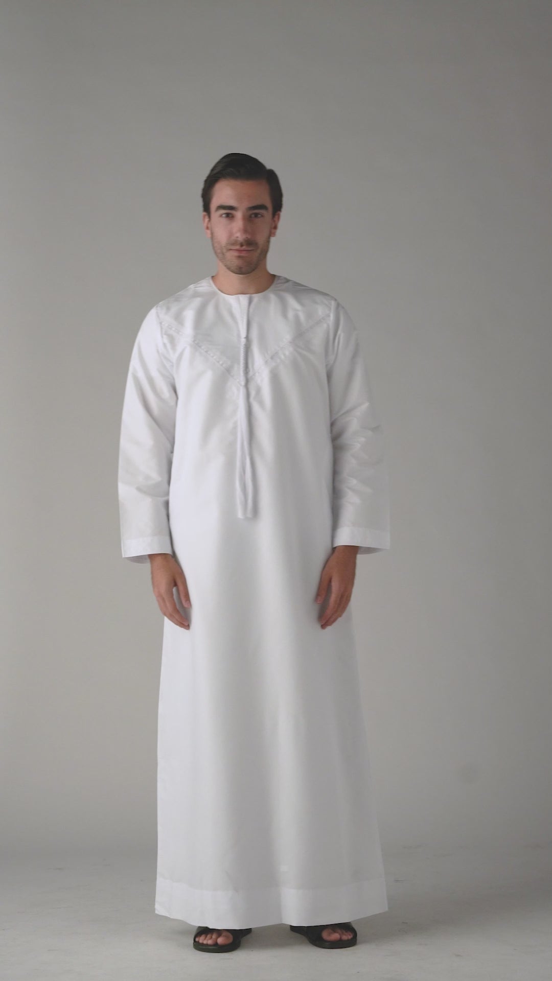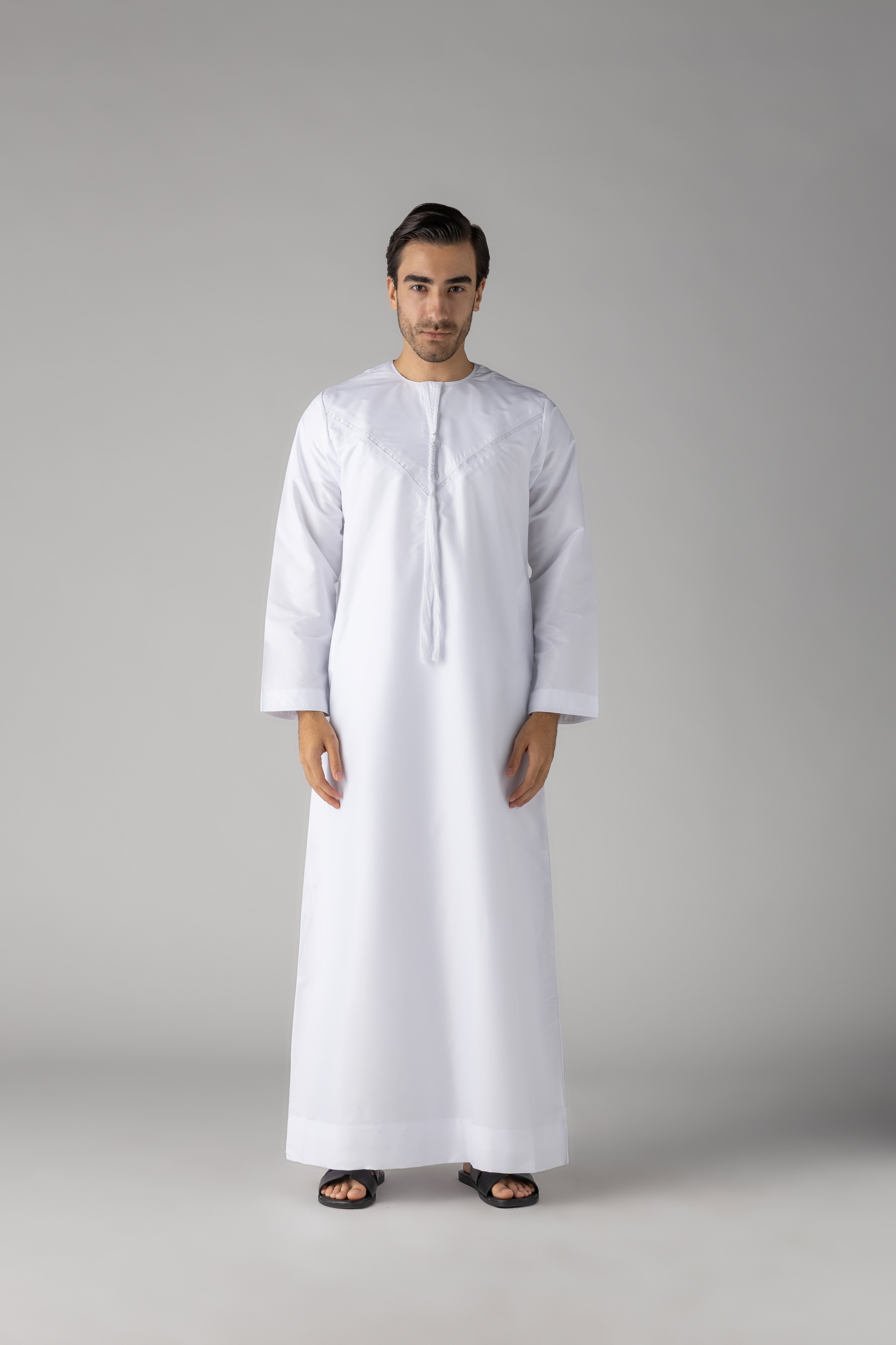 If there's one item that deserves a permanent place in your smart/casual line-up, it's the White Emirati Kandura Omani Thobe. Al Noor Collection White Emirati Thobe Removable Tassel Strong Metal Press Button Opening Side pockets on each side Available S|M|L|XL|XXL|XXXL|XXXXL.