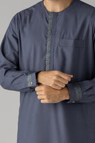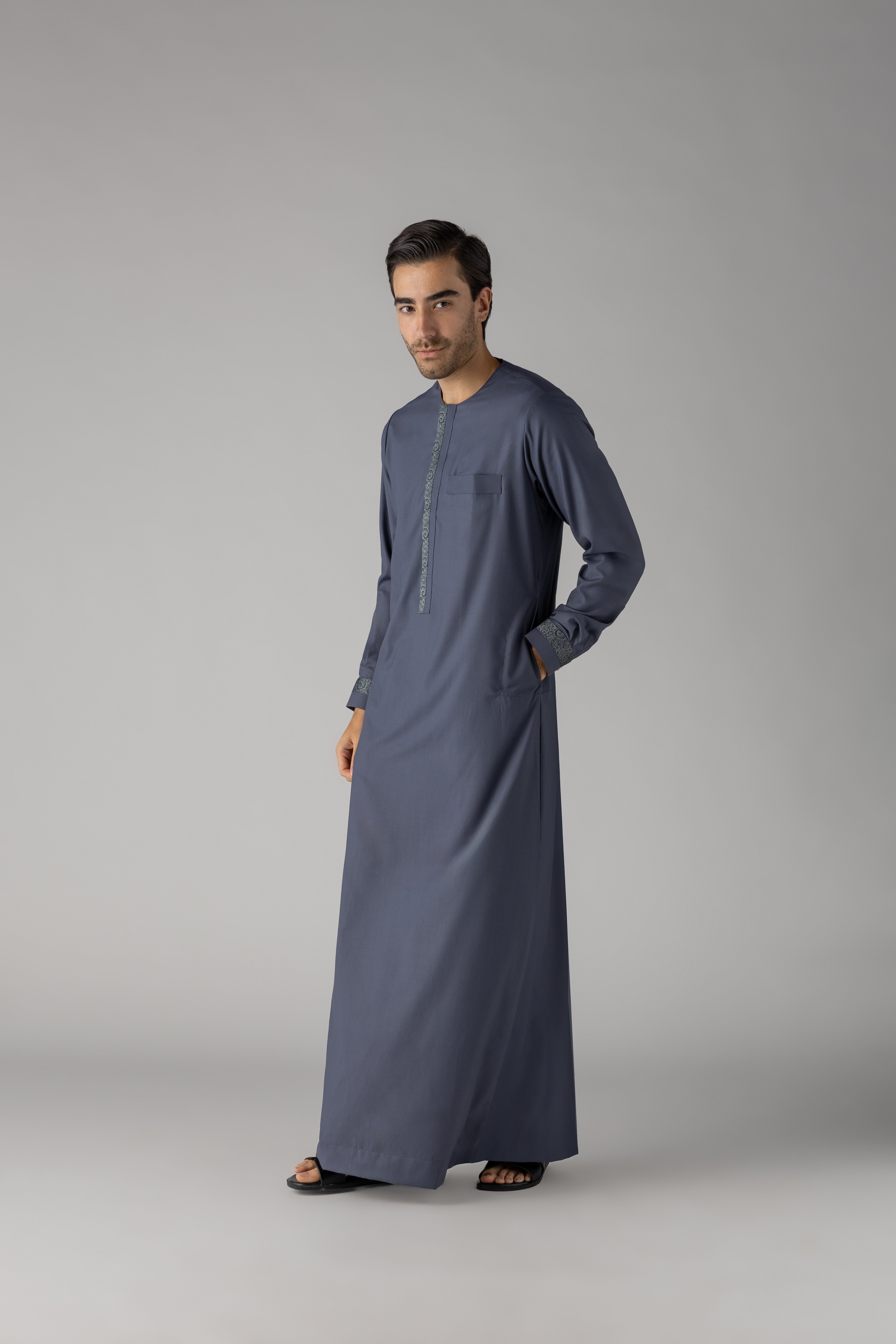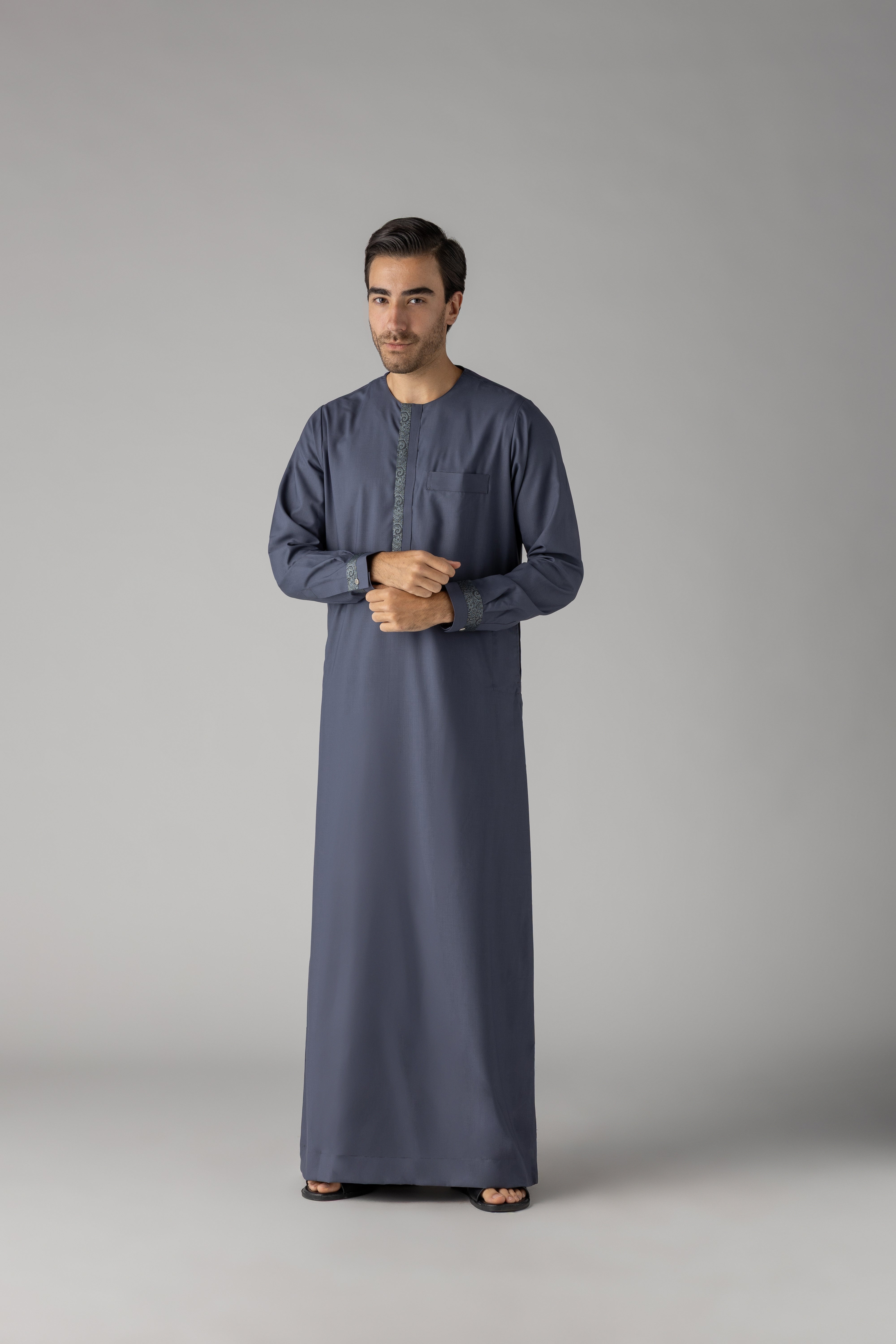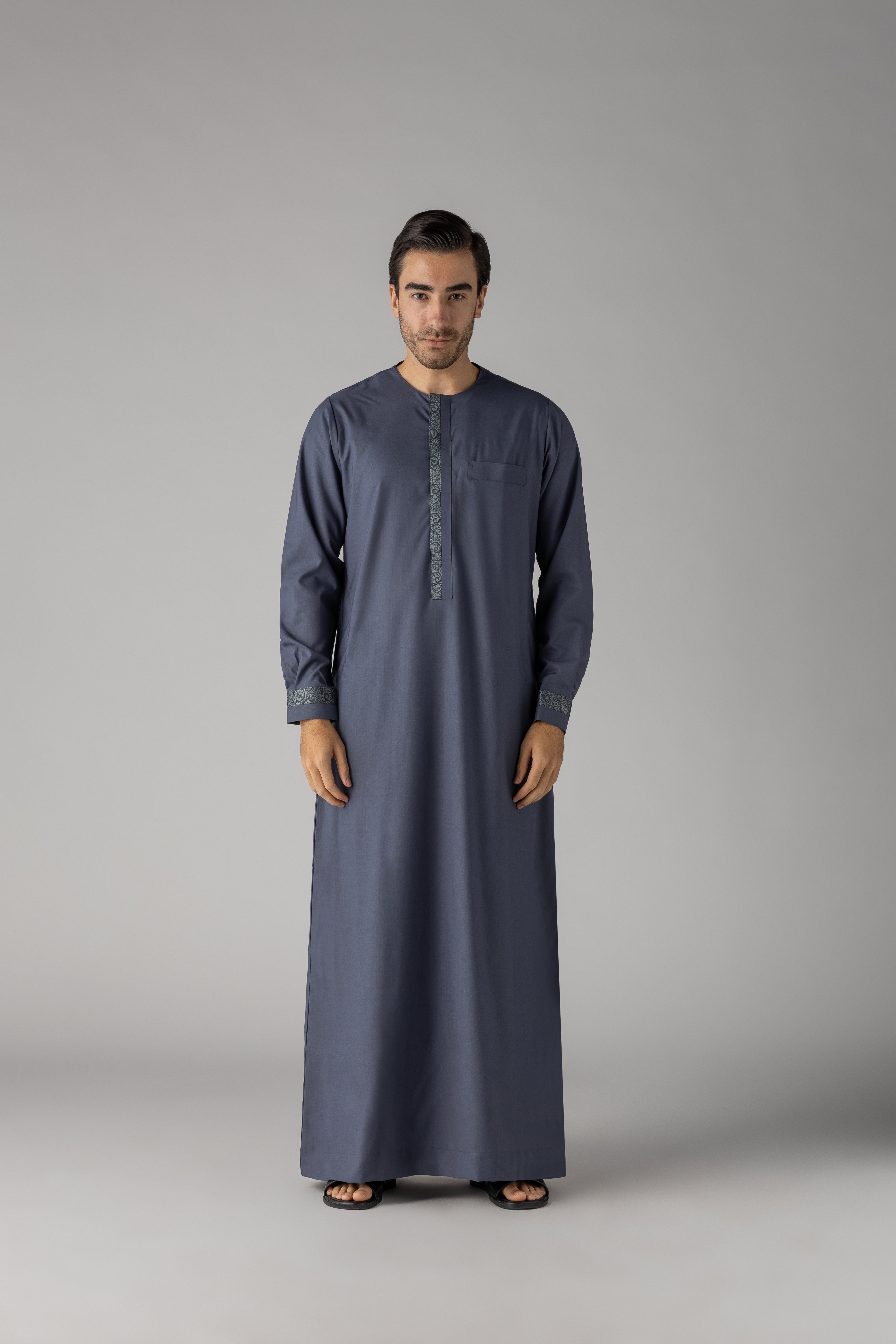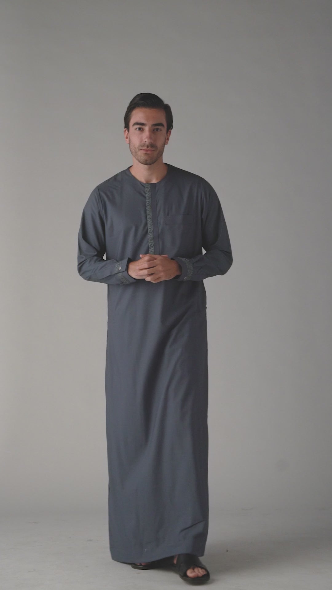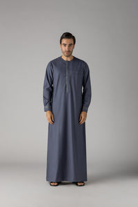 Elevate your wardrobe with the J149 Grey Omani. Part of the Al Noor Collection, this thobe exudes style and elegance. The hidden zip opening and gold buttons on the cuff add a touch of sophistication. Made with soft polyester, it's both comfortable and chic.