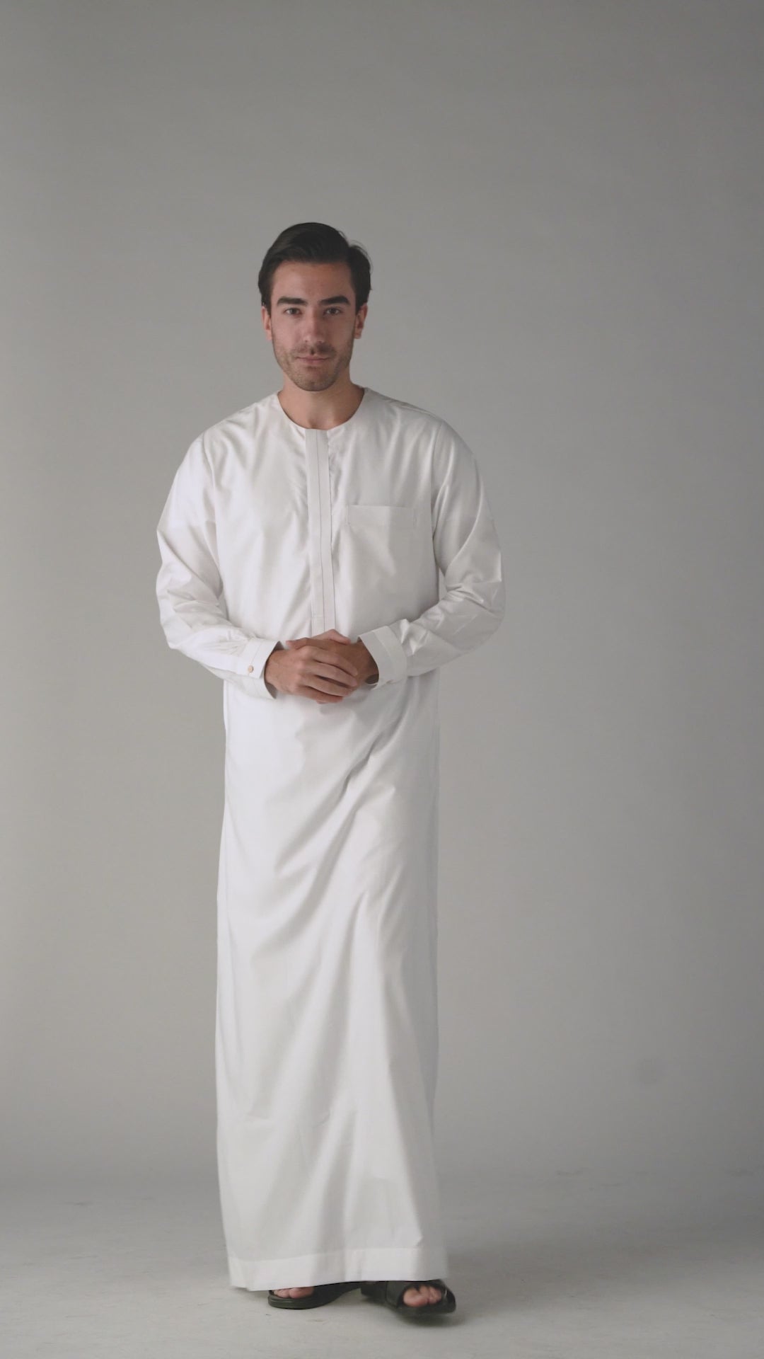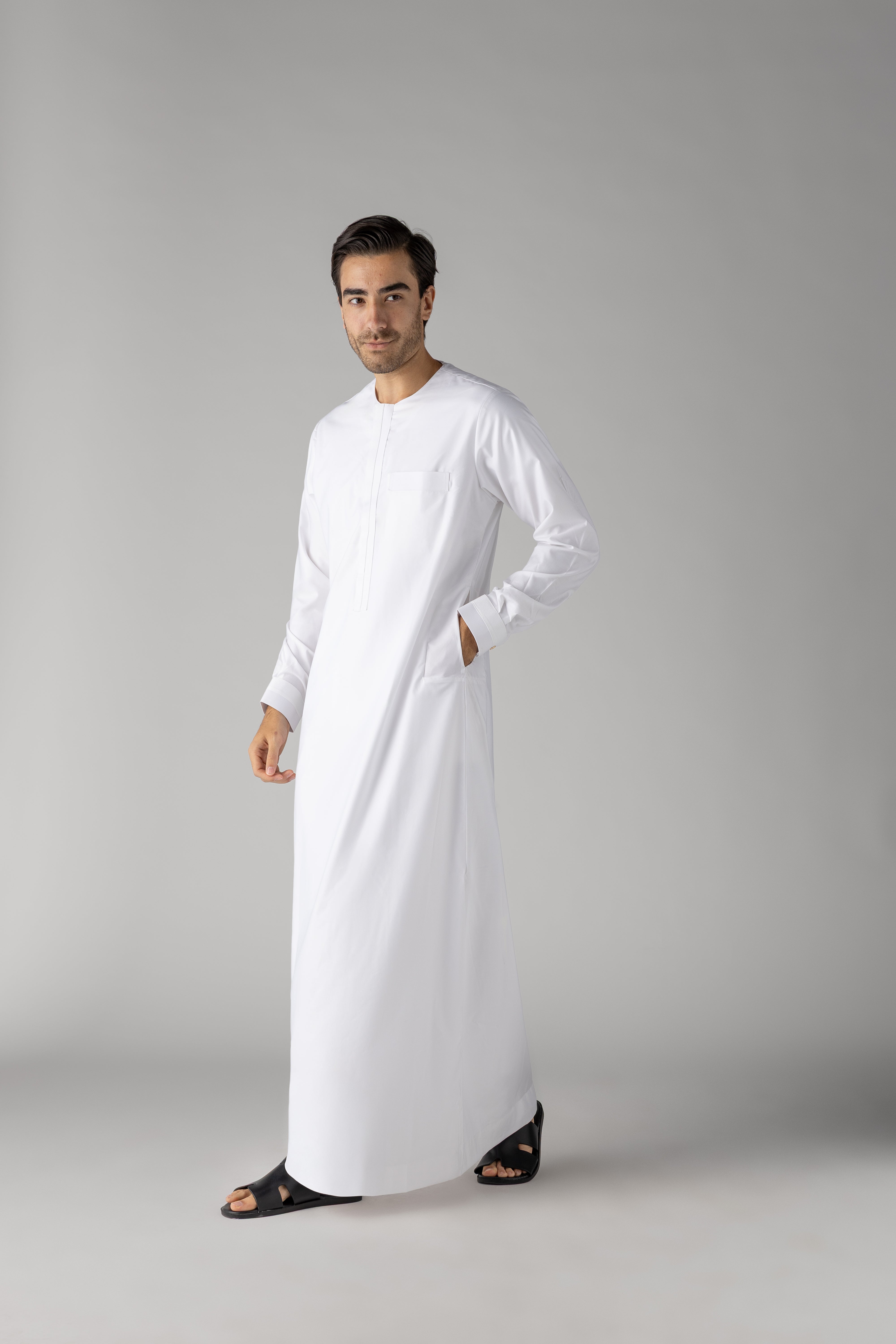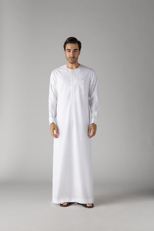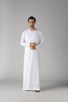 Elevate your wardrobe with the J149 Ghost White Omani. Part of the Al Noor Collection, this thobe exudes style and elegance. The hidden zip opening and White buttons on the cuff add a touch of sophistication. Made with soft polyester, it's both comfortable and chic.