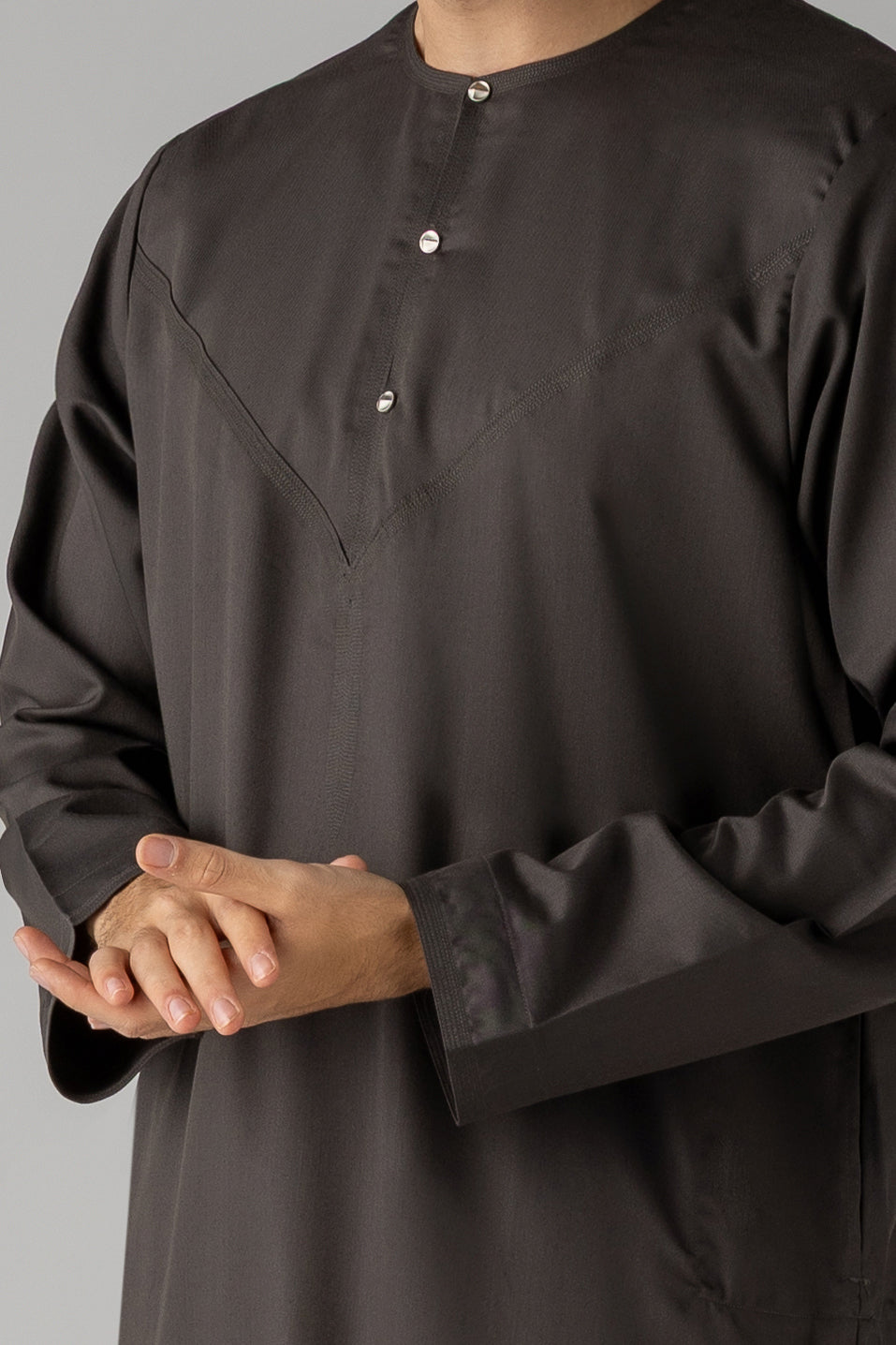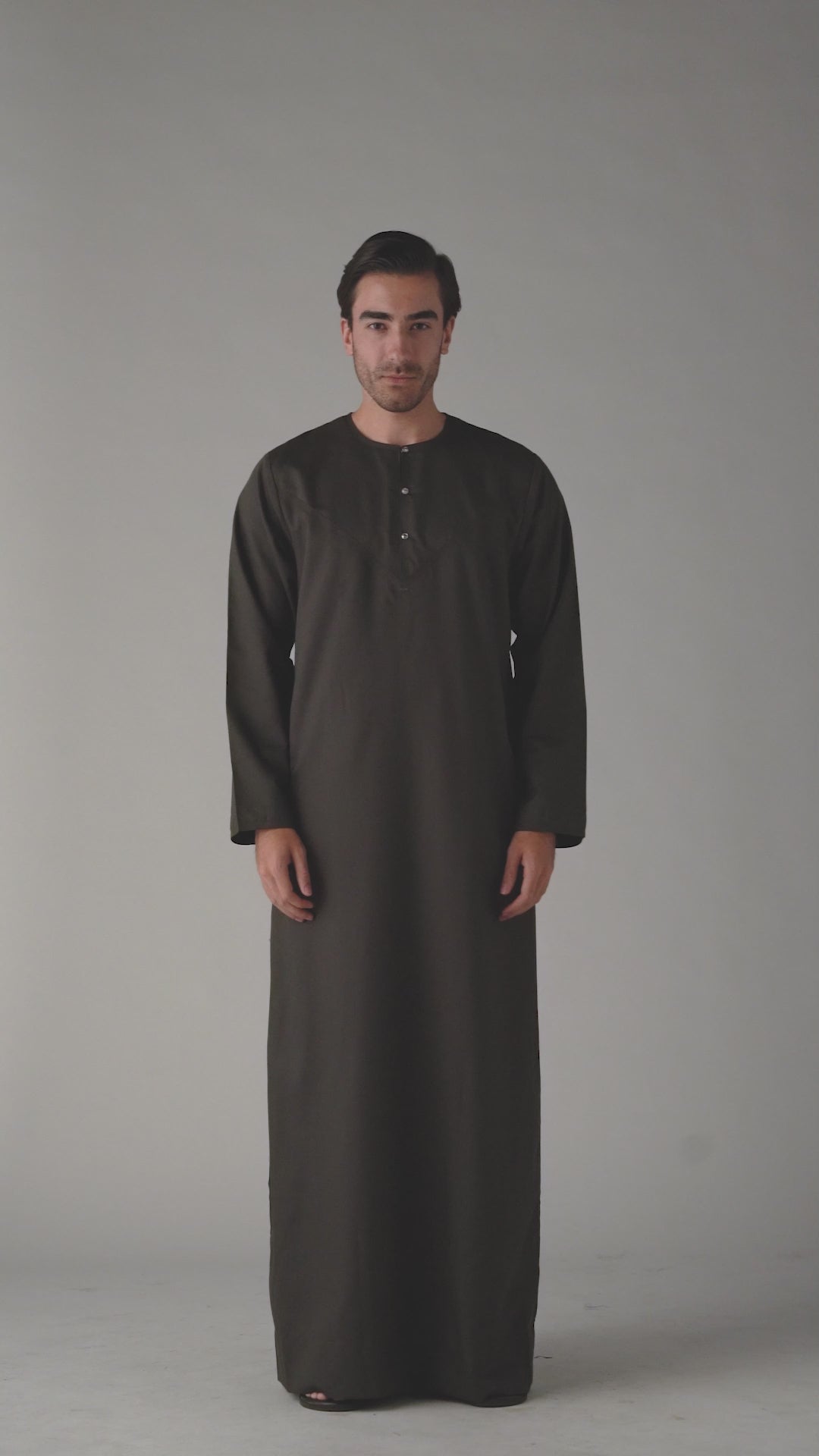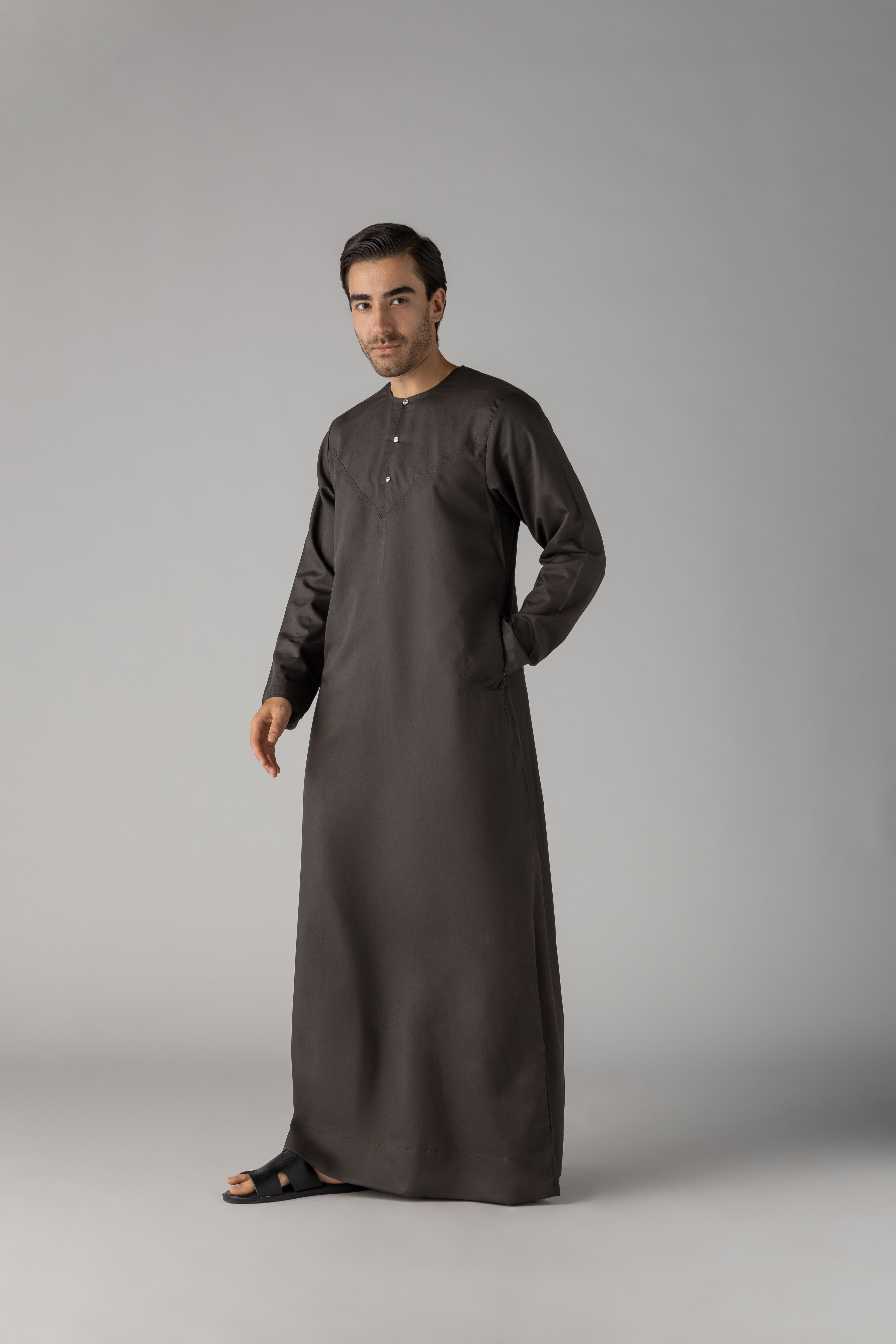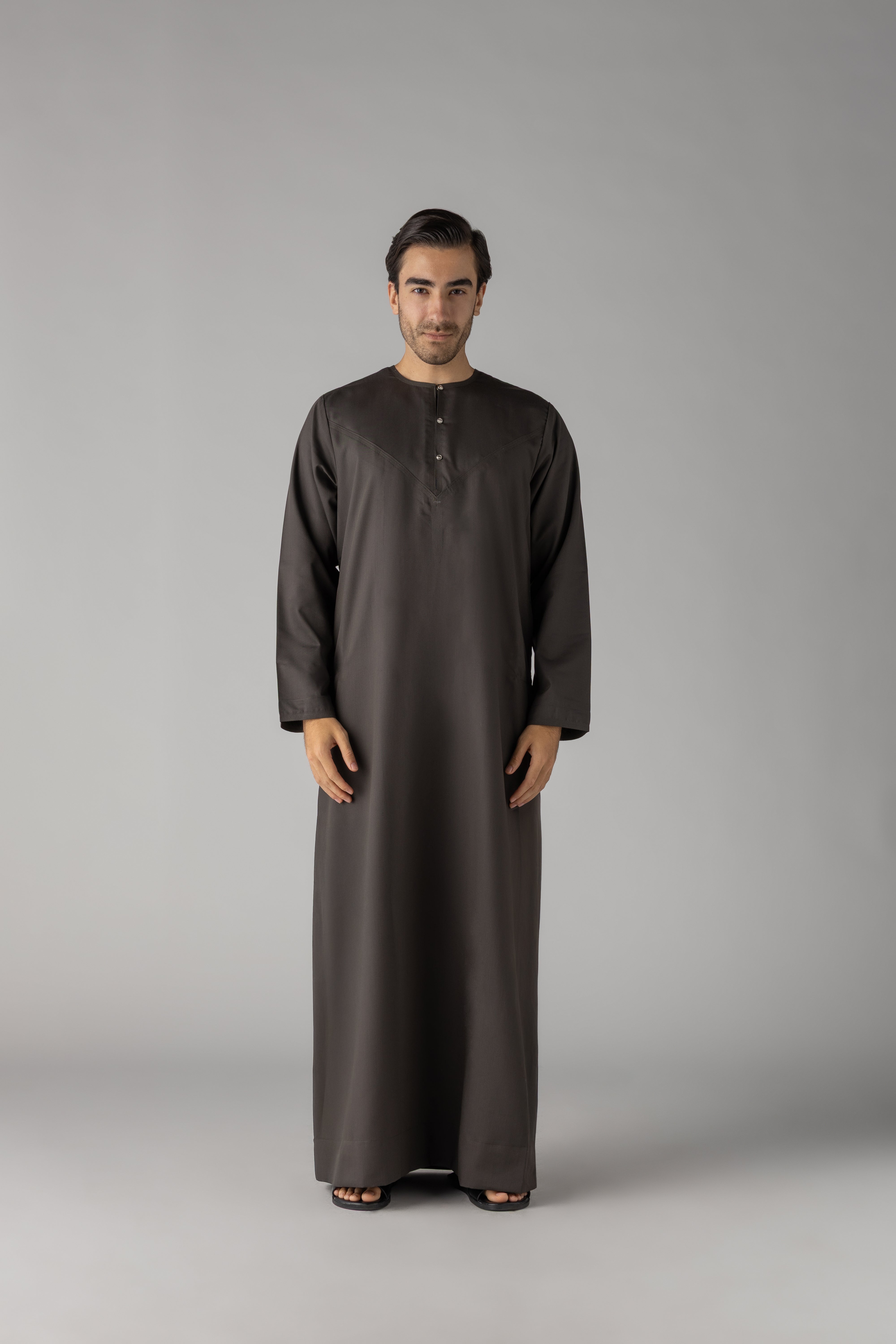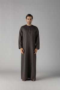 Experience the luxurious comfort and effortless style of our Dark Khaki Omani. Crafted by Al Noor Thobe and soft matt fabric, this traditional thobe features a stylish press metal button opening, 2 side pockets for added convenience, and meticulous stitching. Elevate your wardrobe with this elegant piece.