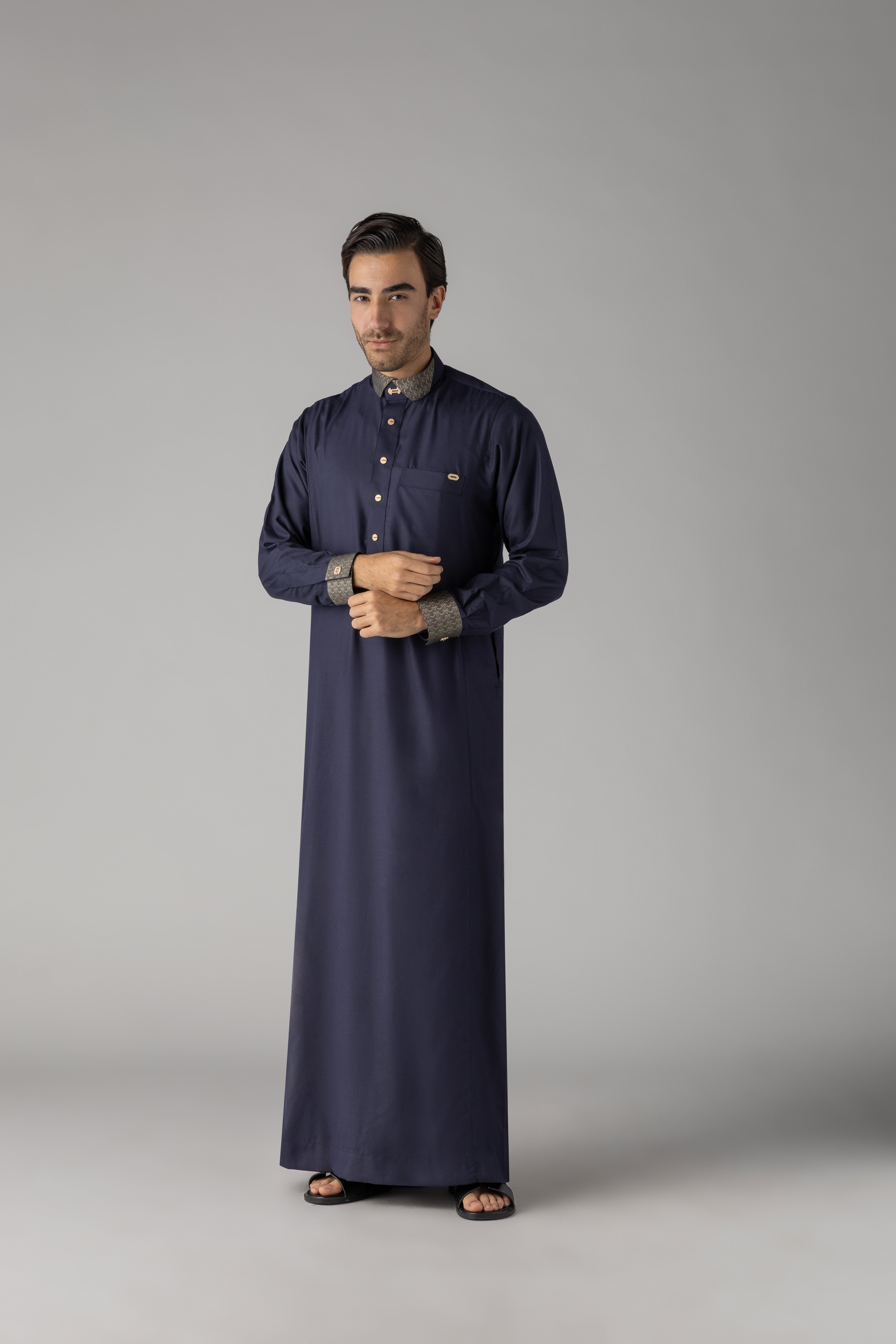 Designed for refined style, the collar and cuffs showcase a subtle patterned fabric in a slightly contrasting shade, enhancing the overall look. With two side pockets and one left chest pocket, this thobe blends practicality with timeless design—perfect for any occasion.