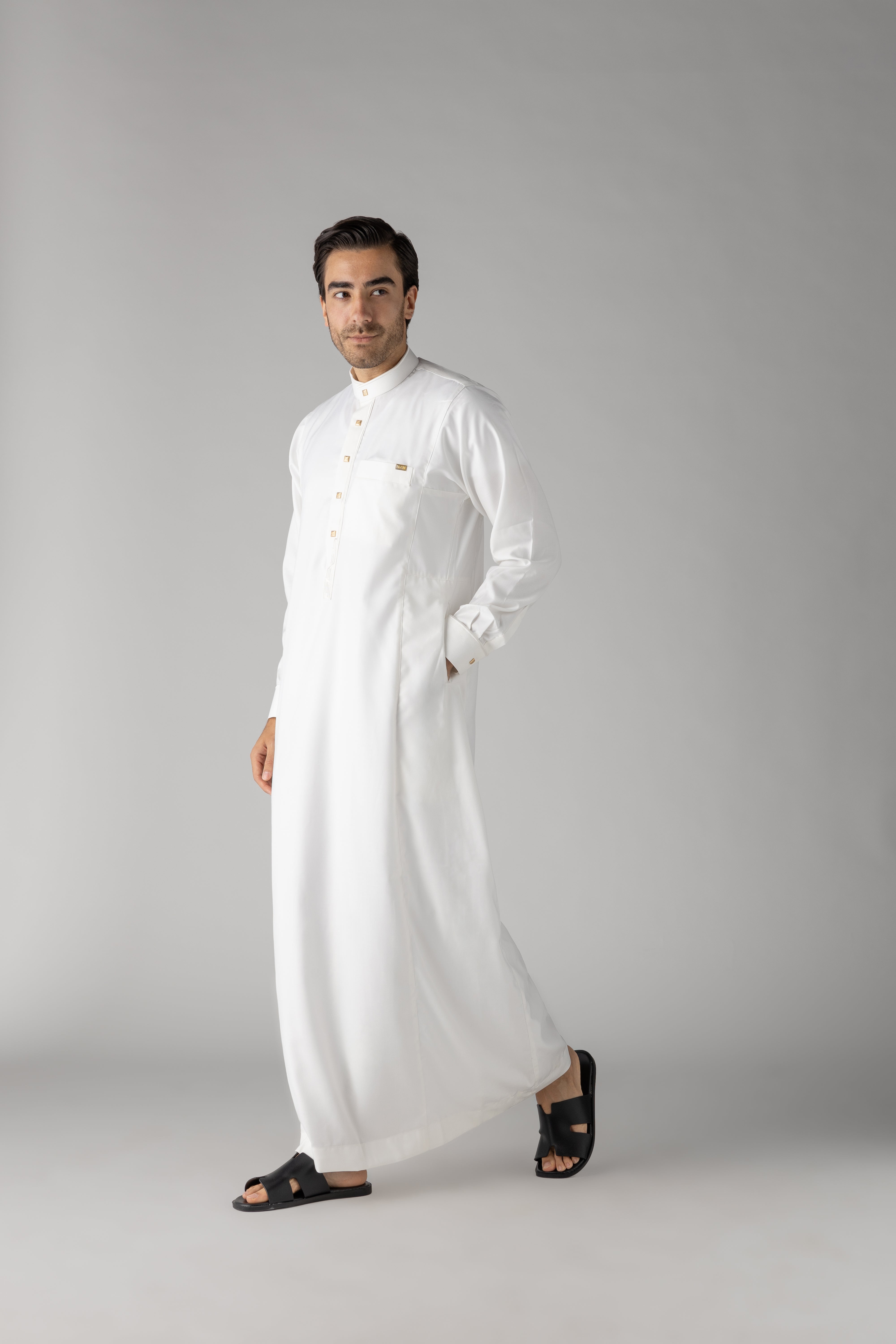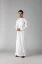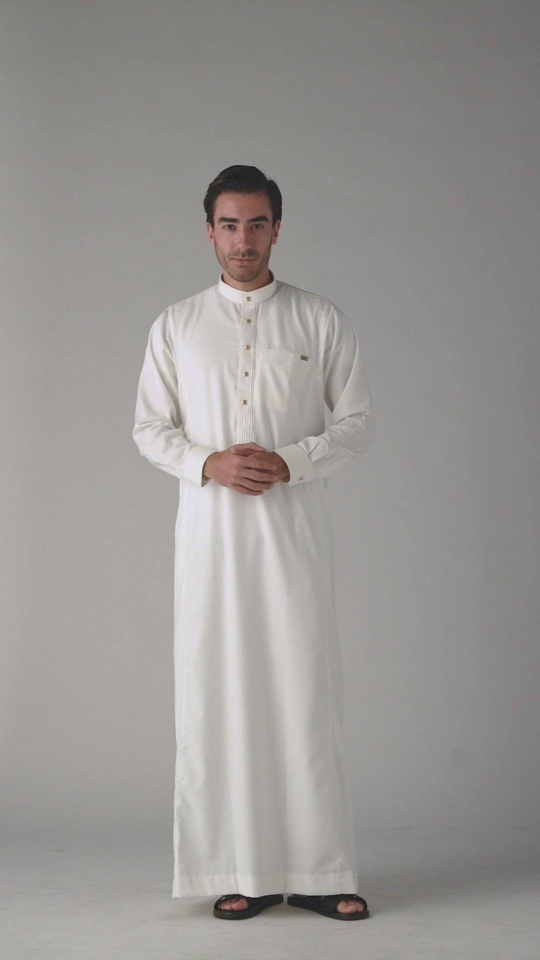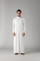 Elevate your wardrobe with the Cream Collar Thobe from the Al Noor Collection, designed for sophistication and elegance. This thobe features: