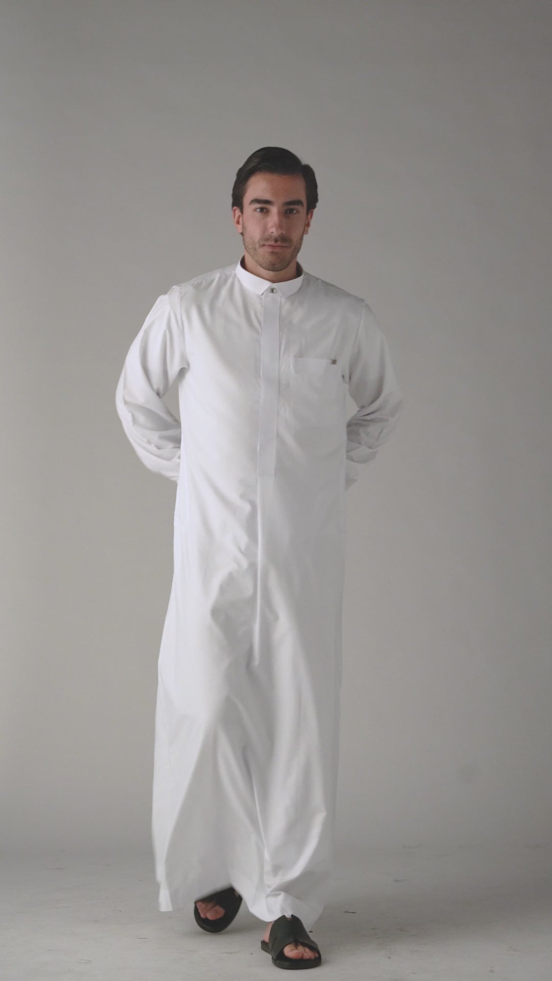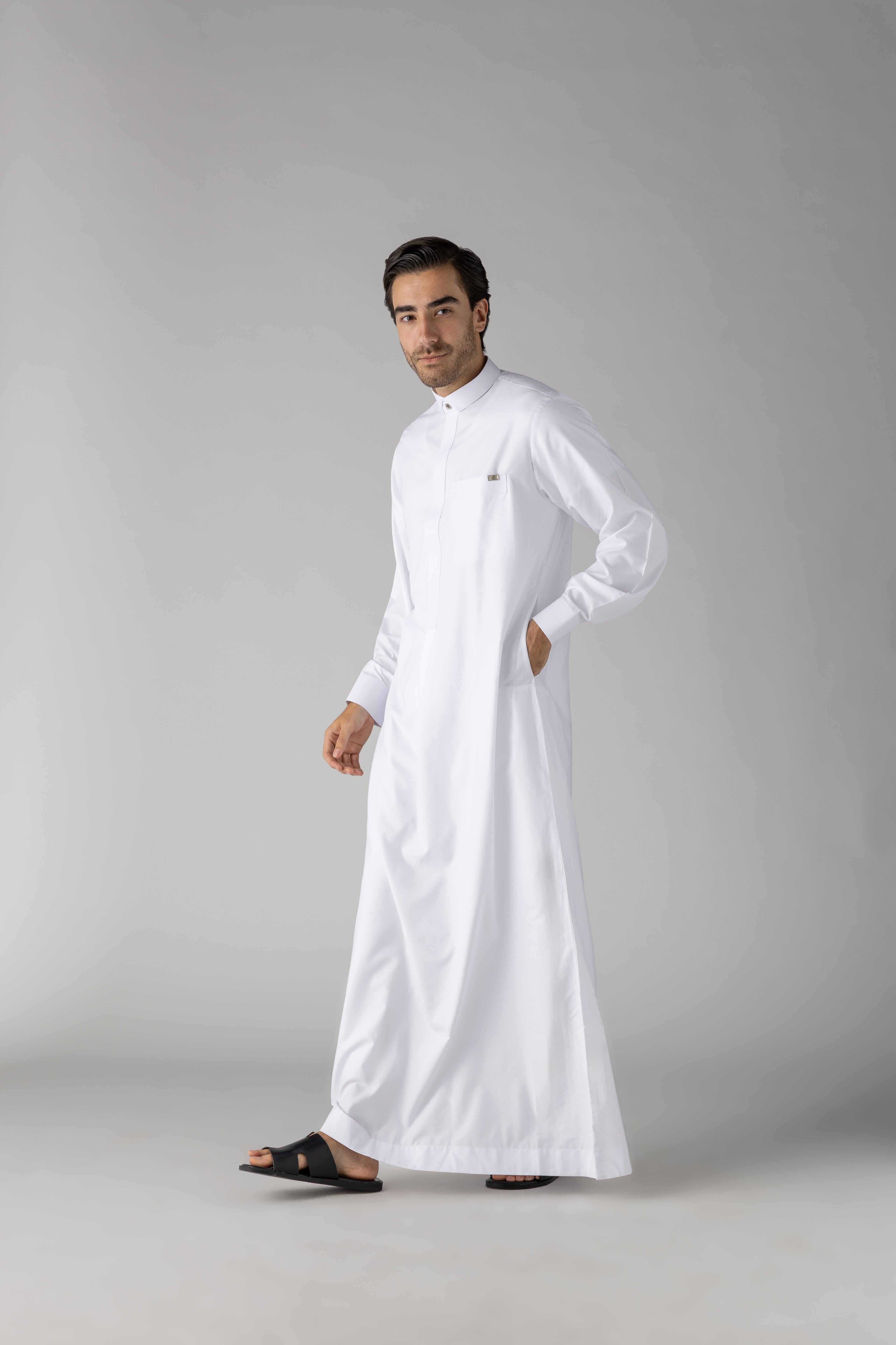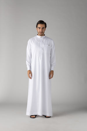 Tuxedo collar Thobe Crafted with sophistication, this White Qatari Cuff Link Thobe from our Wedding Collection is sure to add a touch of luxury to your special day. Expertly tailored with soft polyester fabric, this piece features a unique Qatari style with an elegant pleat on the front and two pleats on the back. Qatari thobe has French cuffs. Completed with silver cuff links, this thobe is presented inside a luxurious gold gift box.
