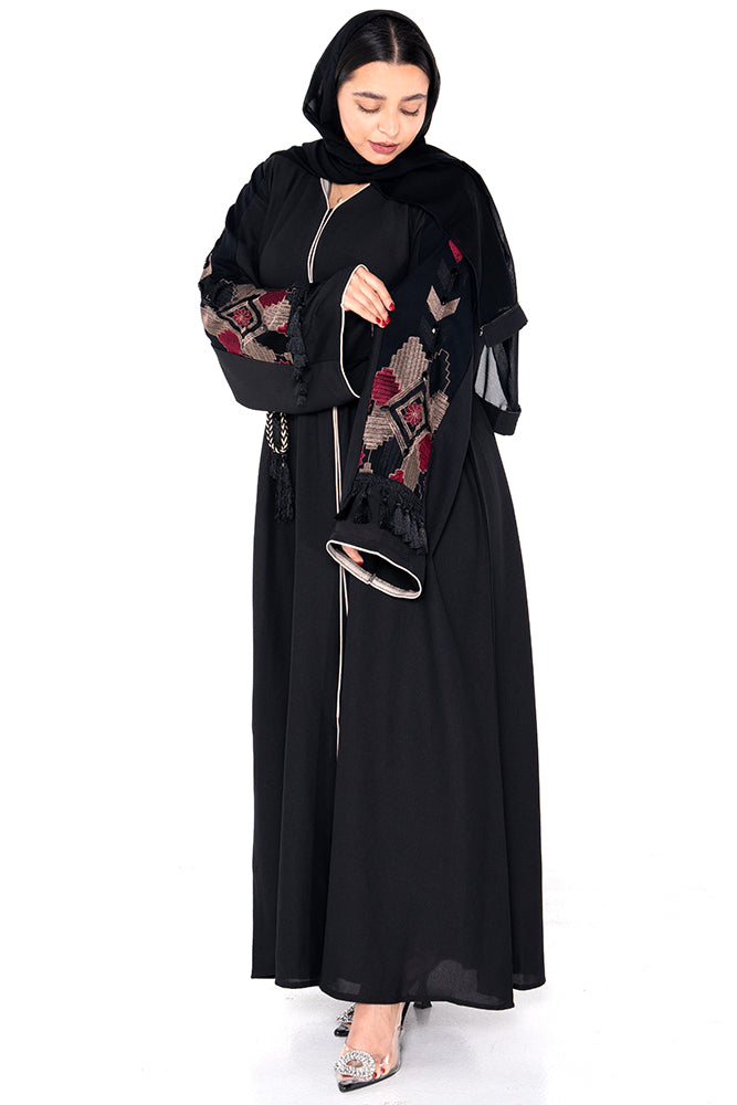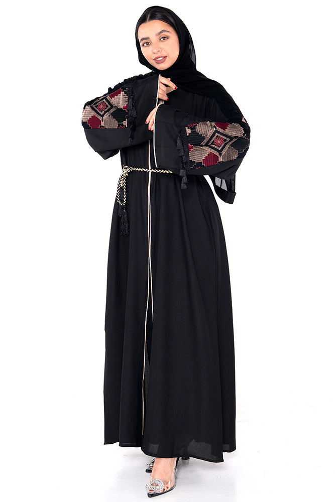 The embroidery's layout draws inspiration from traditional motifs, lending the abaya an artisanal depth that feels both rooted and contemporary. A coordinating rope belt and tassel details add the perfect touch of flair, offering structure and movement in equal measure.