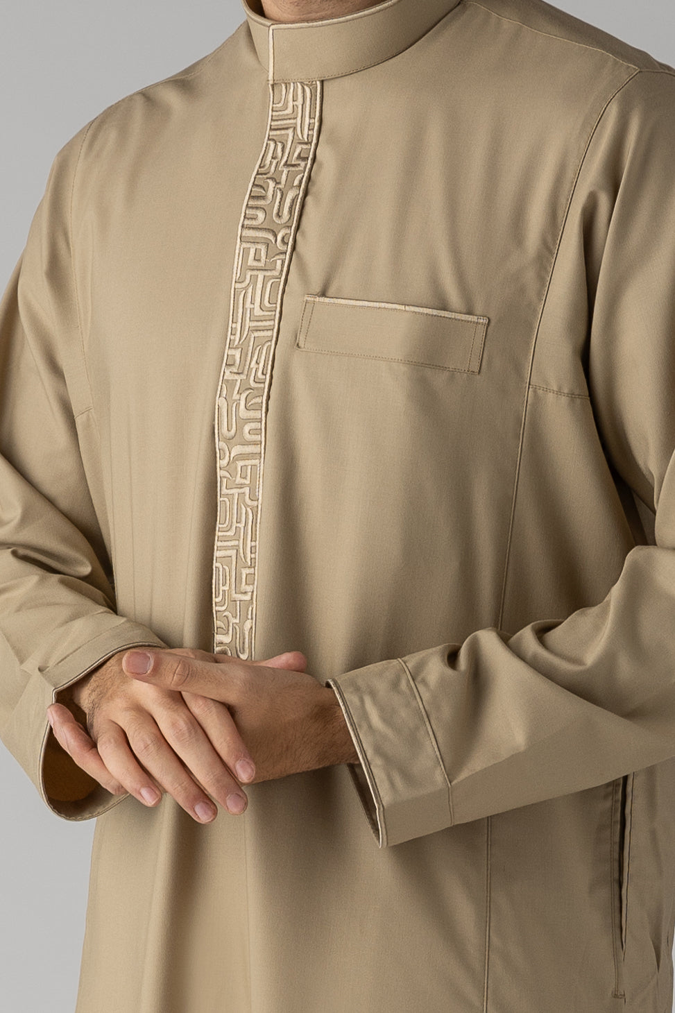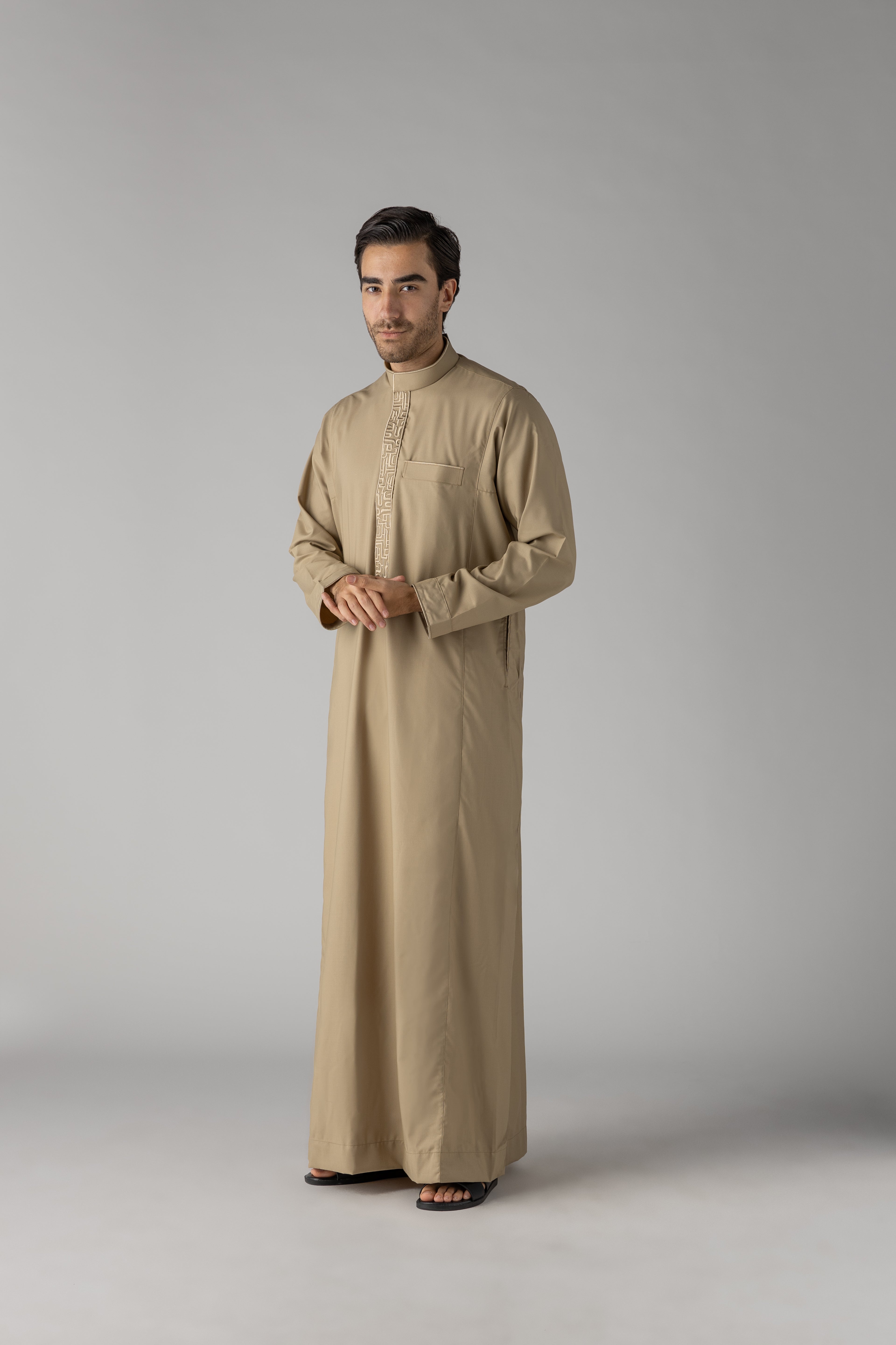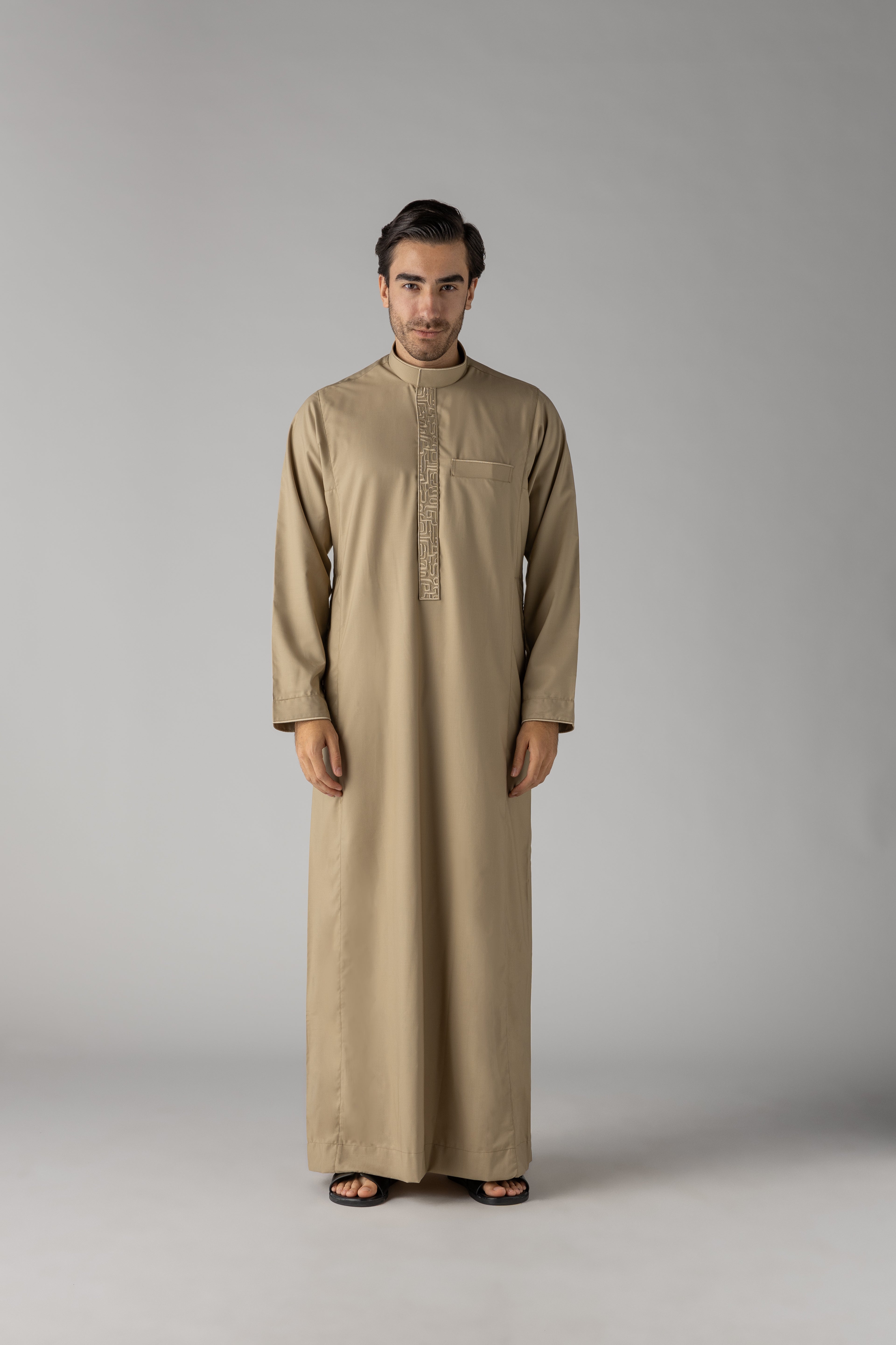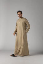 The Huruf Beige Thobe combines timeless elegance with contemporary craftsmanship. This refined garment features a sophisticated neutral palette that complements any complexion, making it an essential addition to your traditional wardrobe. Crafted with attention to detail, the thobe offers comfort and style for both everyday wear and special occasions. The beige tone provides versatility, pairing effortlessly with various accessories and footwear. Perfect for those who appreciate understated luxury and quality in their Islamic attire.