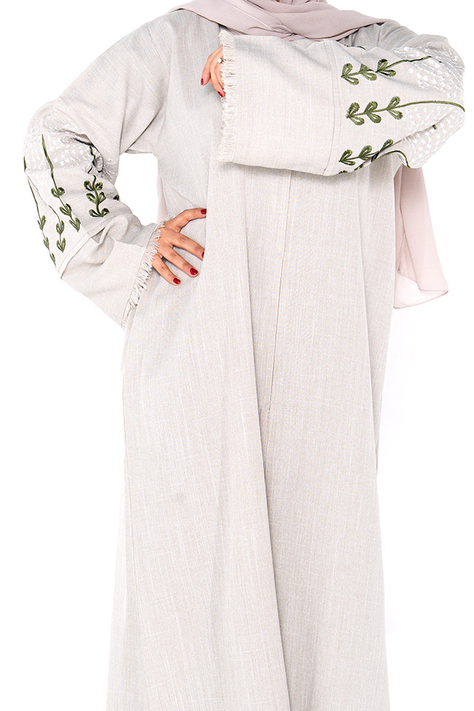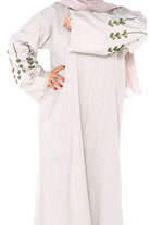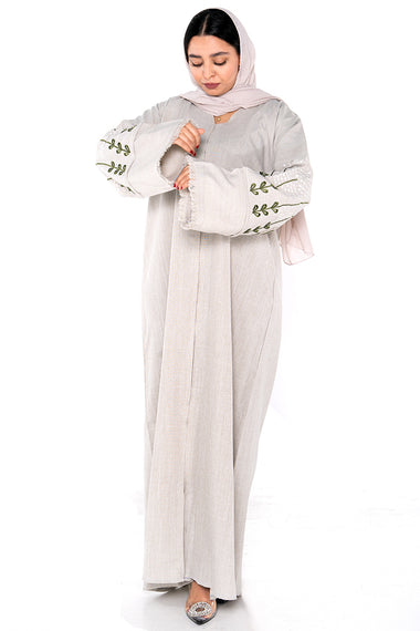 Step into effortless elegance with our Cream Linen Meadow Abaya, a graceful fusion of nature-inspired design and contemporary modest fashion. Crafted from breathable linen in a soft cream tone, this abaya features beautifully embroidered sleeves adorned with olive-toned leaf motifs—bringing a refreshing botanical charm to your wardrobe.