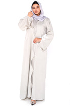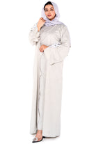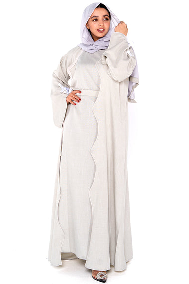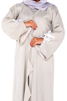 Soft, elegant, and effortlessly modest — this light grey abaya is crafted from breathable linen fabric for a comfortable, airy fit. The standout feature is its chic bow detailing on the sleeves, adding a feminine and playful touch to a timeless silhouette.
