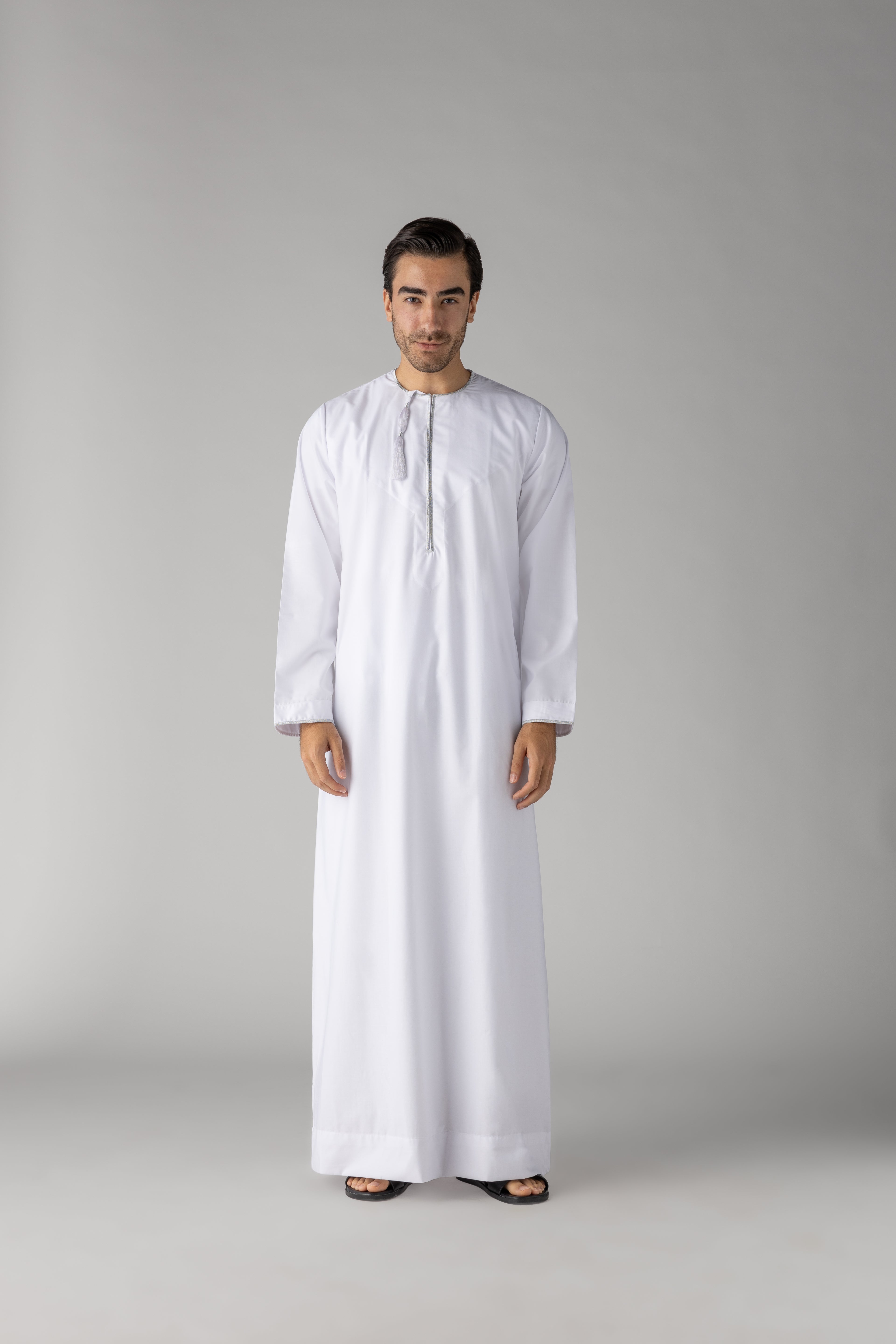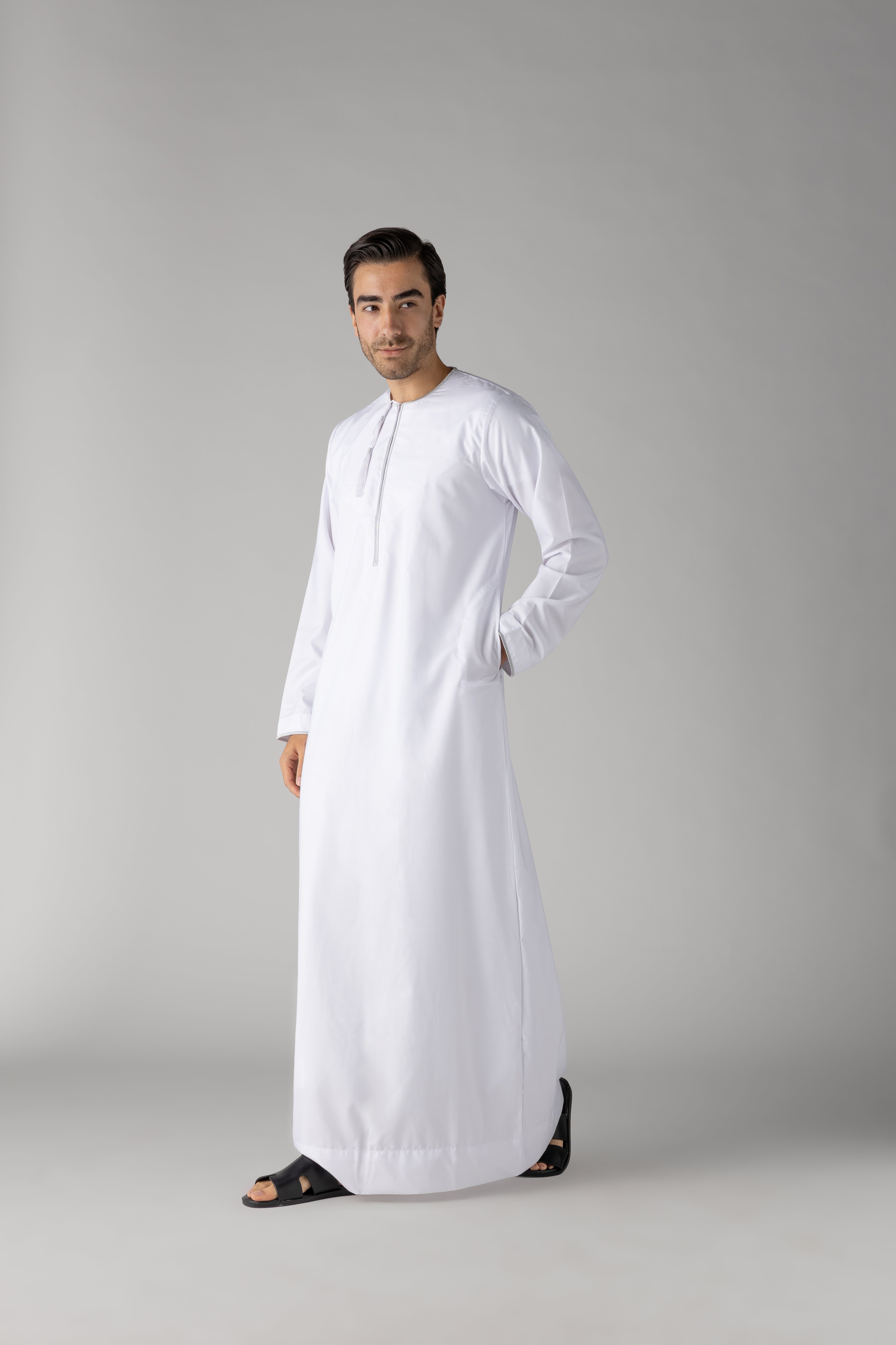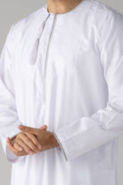 The White Silver Habeel Omani Thobe presents a pristine white silhouette enhanced by elegant silver detailing. This finely tailored garment combines traditional craftsmanship with a modern, sophisticated touch, perfect for making a polished impression at formal events. Its subtle yet striking contrast adds depth, embodying both cultural richness and refined style.
